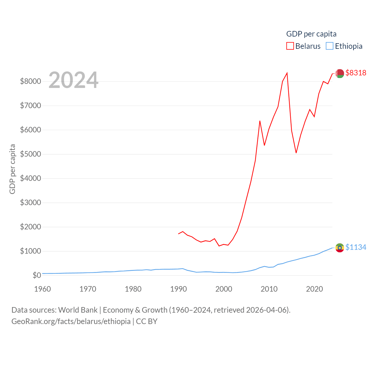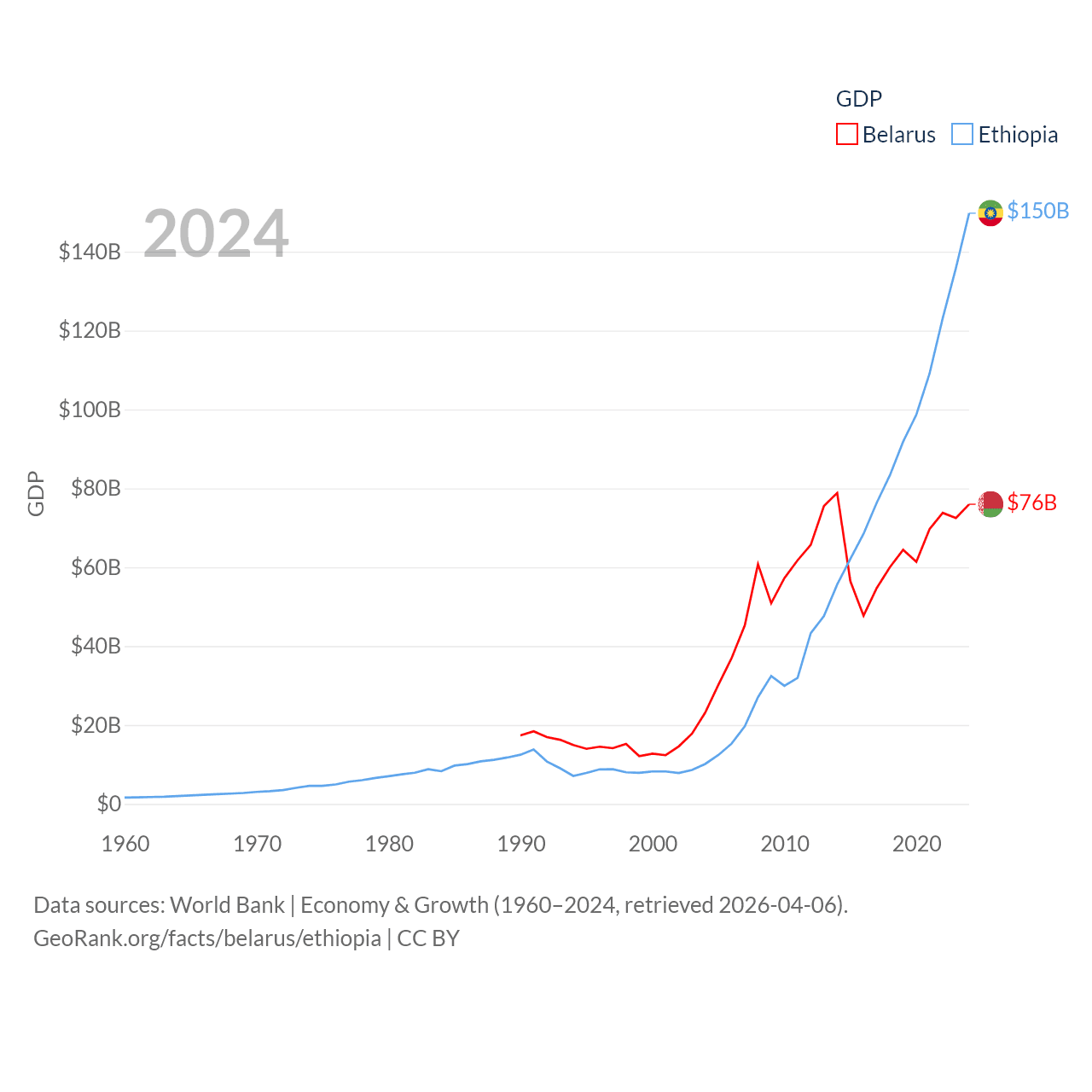 By GDP, Belarus ranks 83/197 ($76B) and Ethiopia ranks 60/197 ($150B). By GDP per capita, Belarus ranks 92/197 ($8,318), while Ethiopia ranks 171/197 ($1,134).
