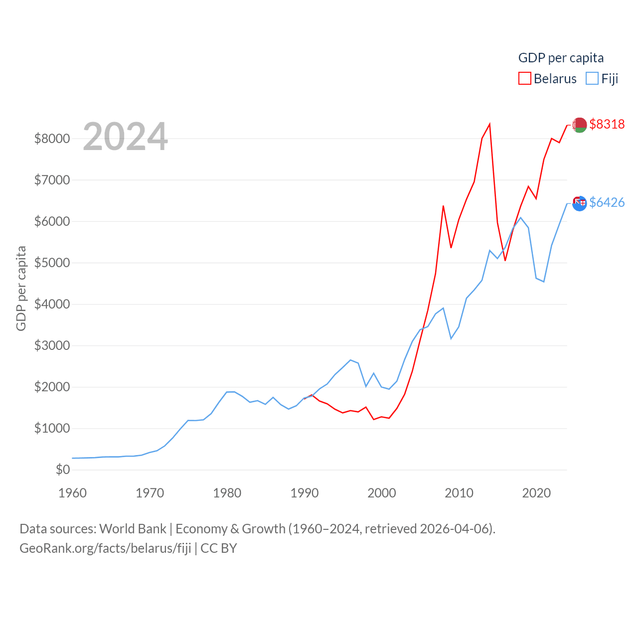 By GDP, Belarus ranks 83/197 ($76B) and Fiji ranks 161/197 ($5.97B). By GDP per capita, Belarus ranks 92/197 ($8,318), while Fiji ranks 108/197 ($6,426).