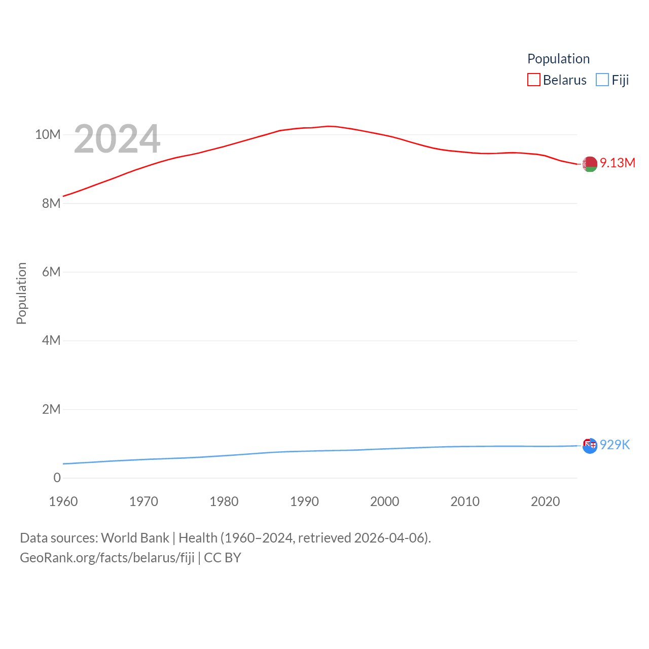 Belarus has a population of 9.13M (ranked 100/197), compared with 929K in Fiji (ranked 159/197). Belarus' land area is 78,372 sq mi versus 7,054 sq mi for Fiji (ranked 83rd vs. 152nd).