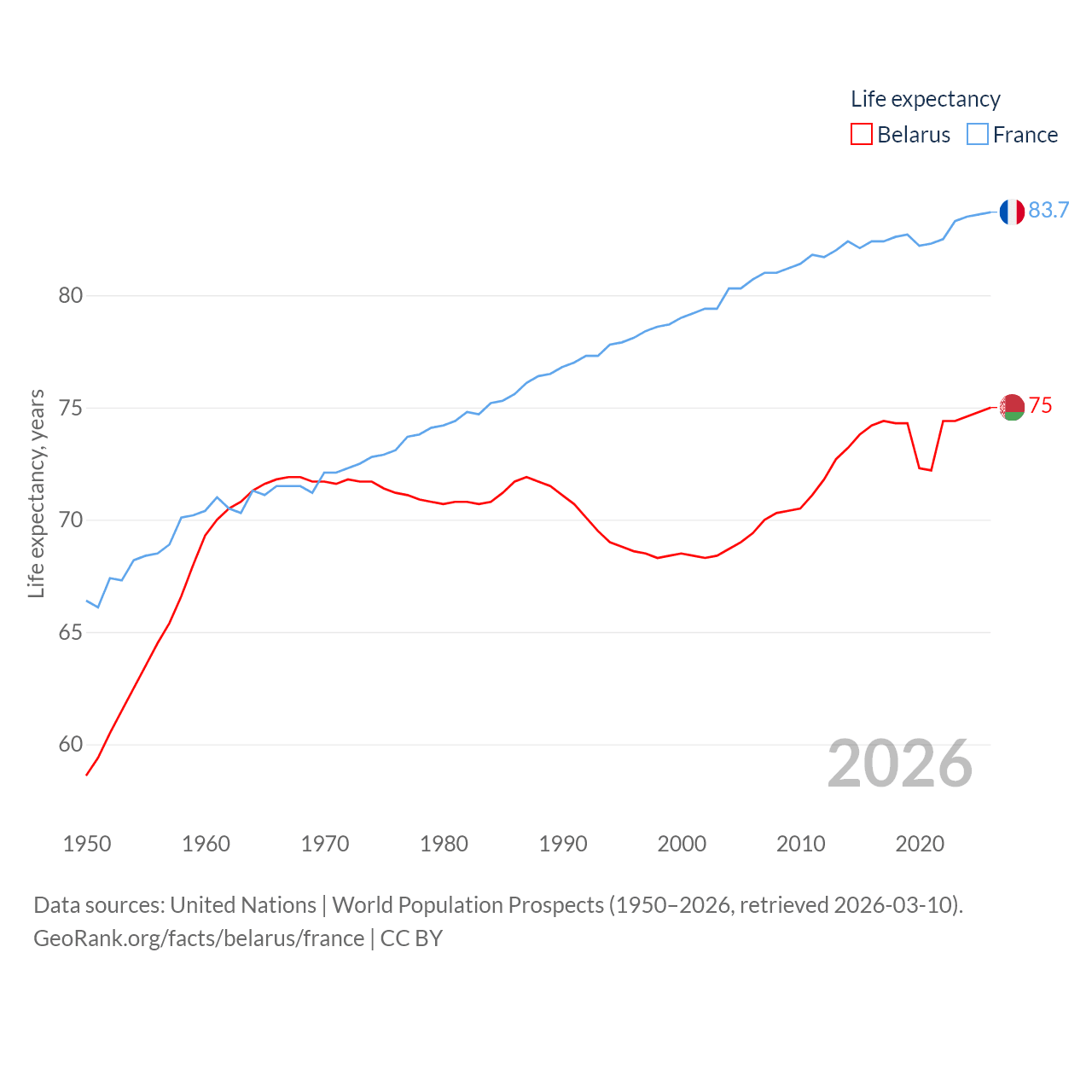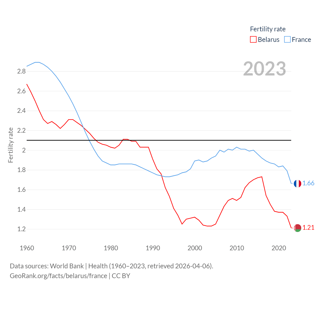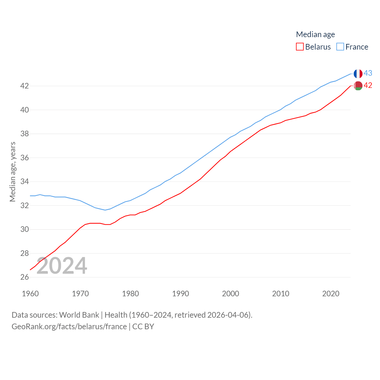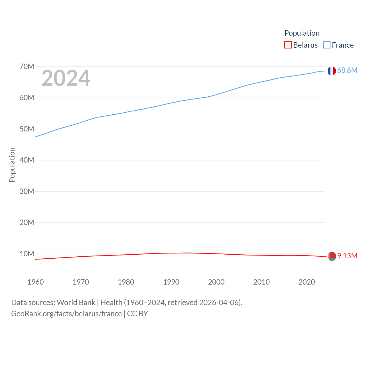 Belarus has a population of 9.13M (ranked 100/197), compared with 68.6M in France (ranked 23/197). Belarus' land area is 78,372 sq mi versus 208,090 sq mi for France (ranked 83rd vs. 48th).