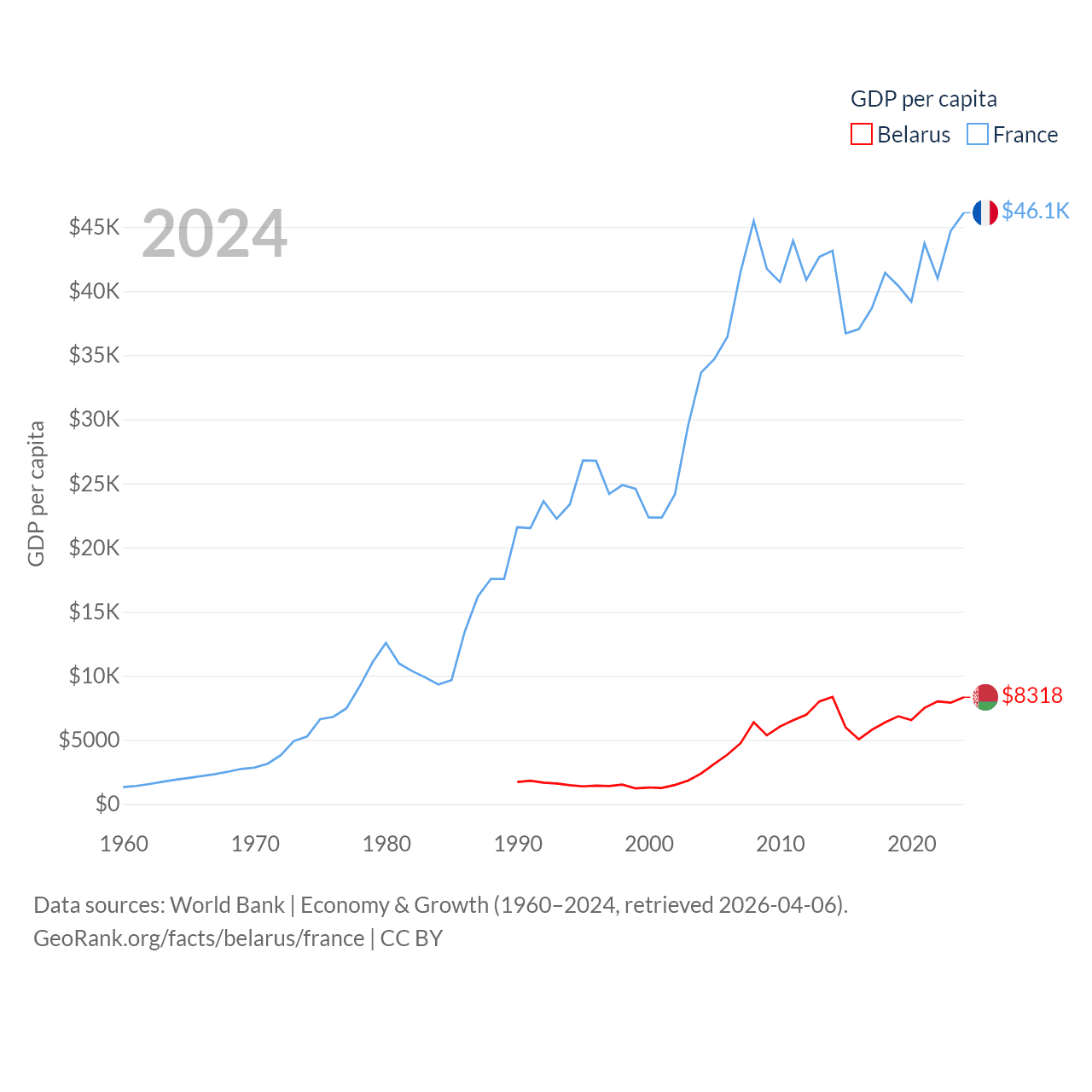 By GDP, Belarus ranks 83/197 ($76B) and France ranks 7/197 ($3.16T). By GDP per capita, Belarus ranks 92/197 ($8,318), while France ranks 27/197 ($46,103).