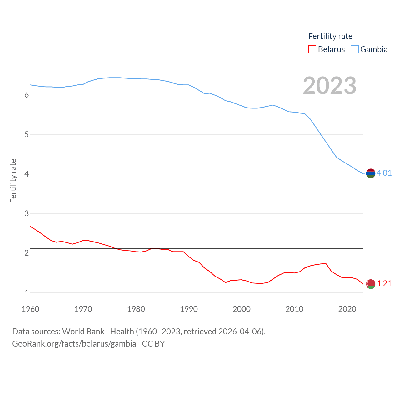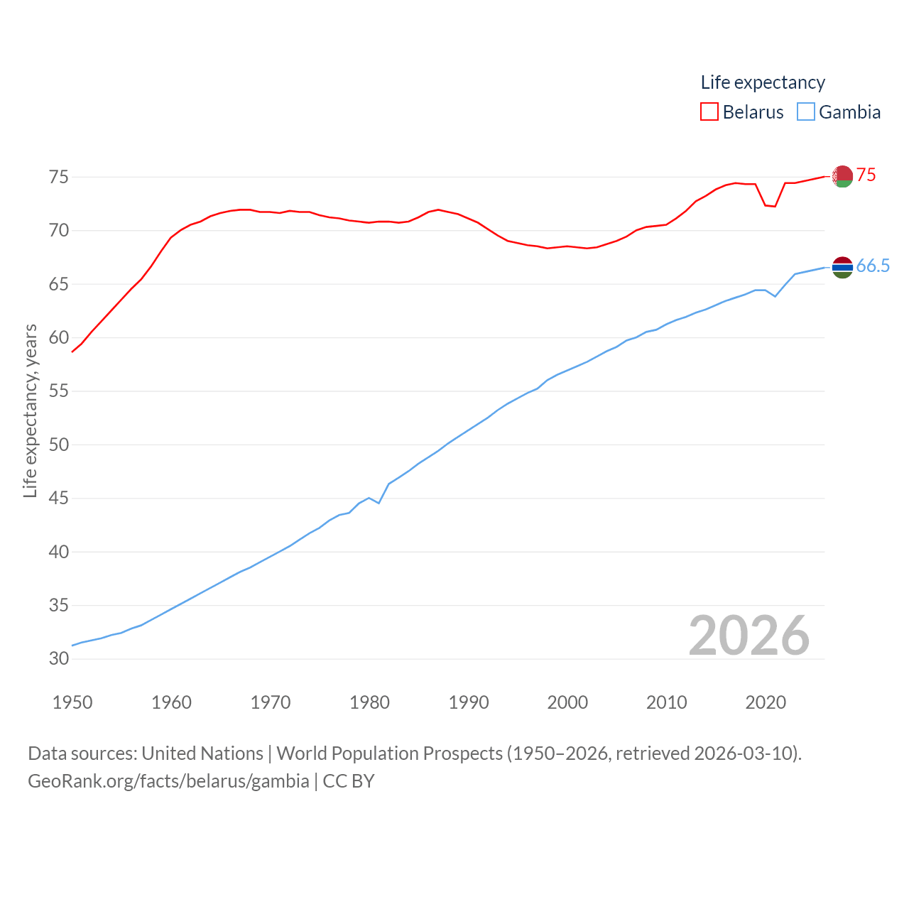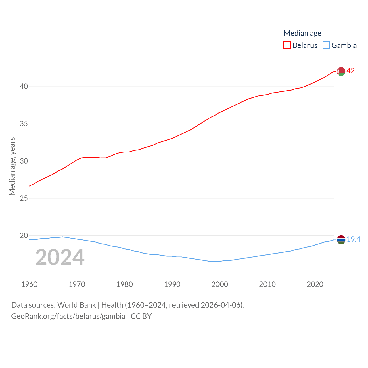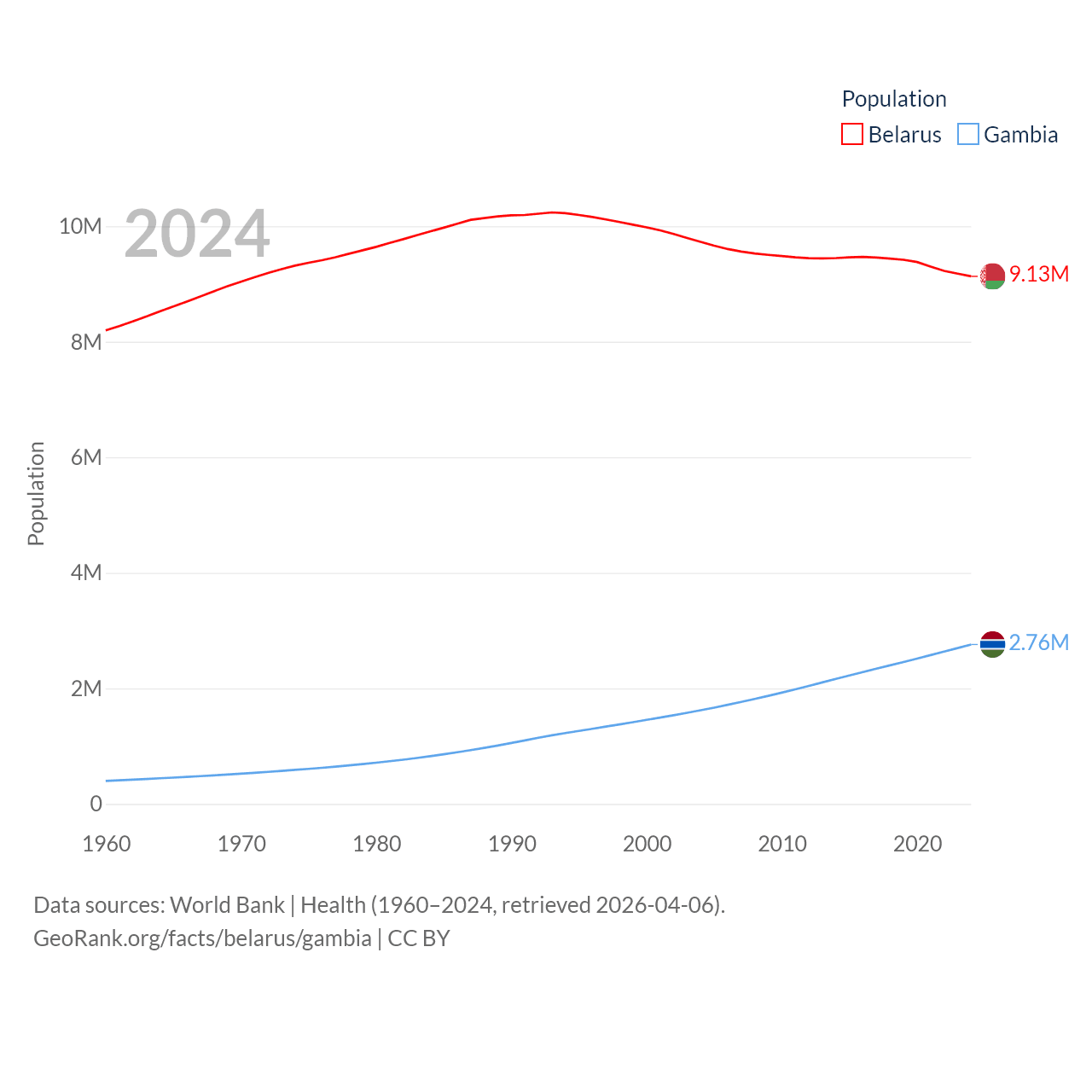 Belarus has a population of 9.13M (ranked 100/197), compared with 2.76M in The Gambia (ranked 140/197). Belarus' land area is 78,372 sq mi versus 3,907 sq mi for The Gambia (ranked 83rd vs. 161st).