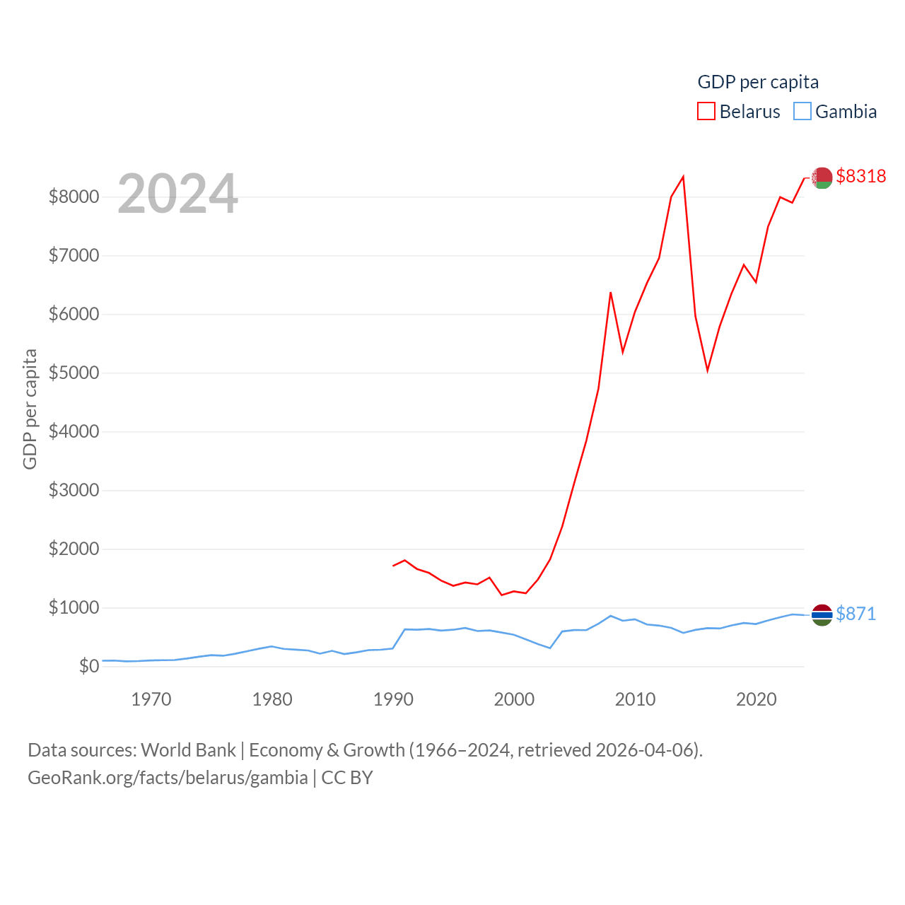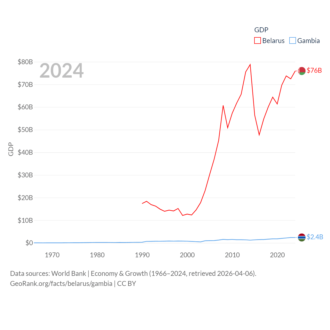 By GDP, Belarus ranks 83/197 ($76B) and The Gambia ranks 174/197 ($2.4B). By GDP per capita, Belarus ranks 92/197 ($8,318), while The Gambia ranks 183/197 ($871).