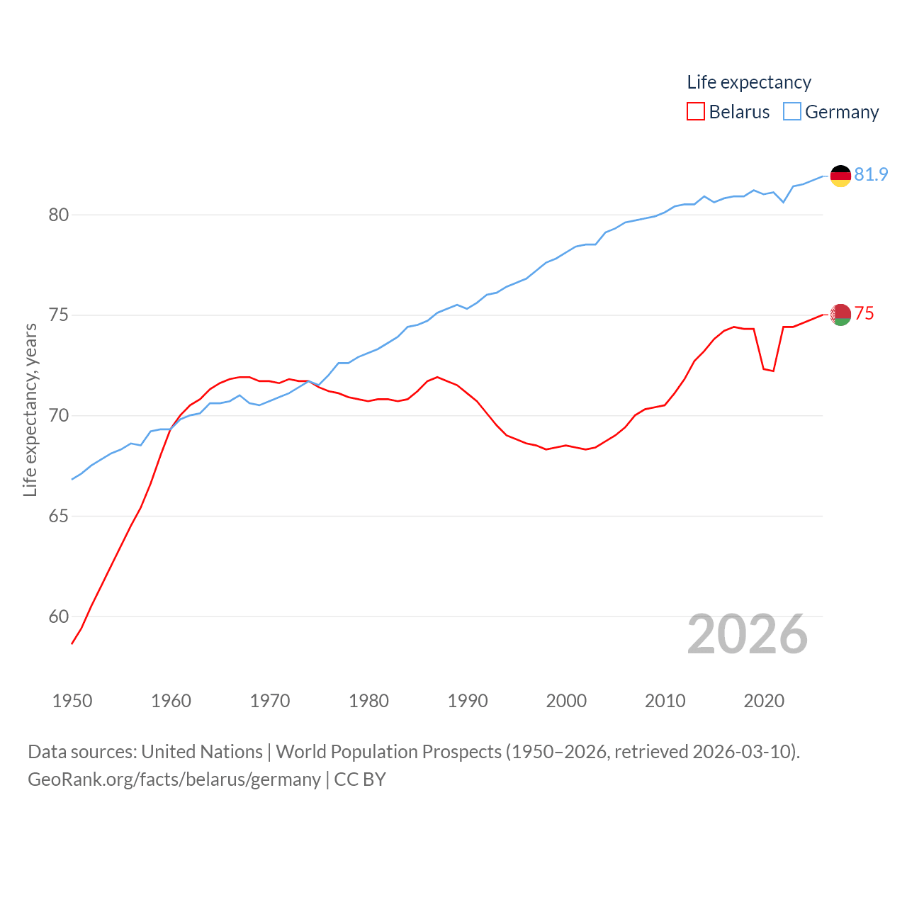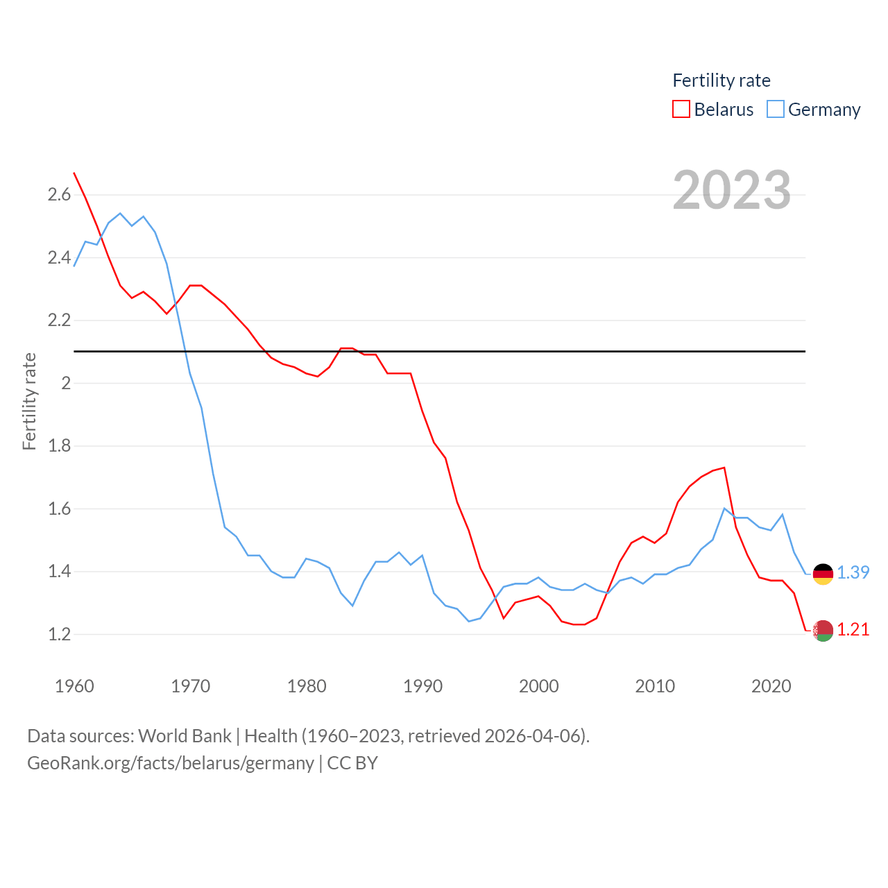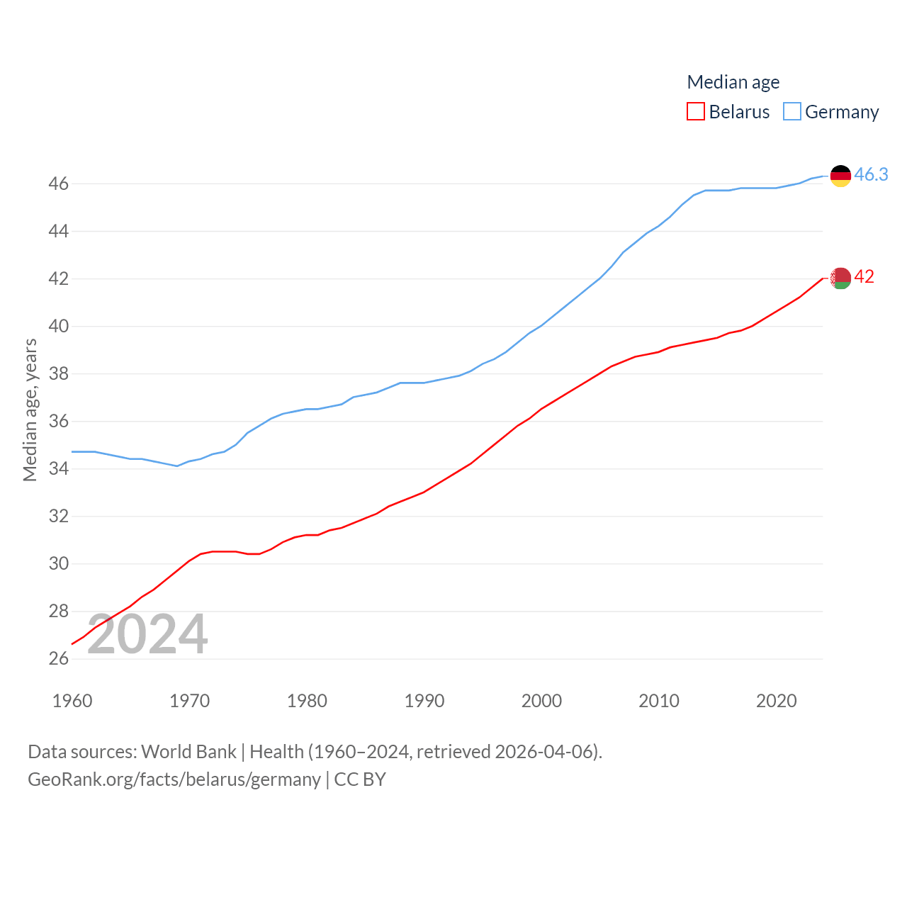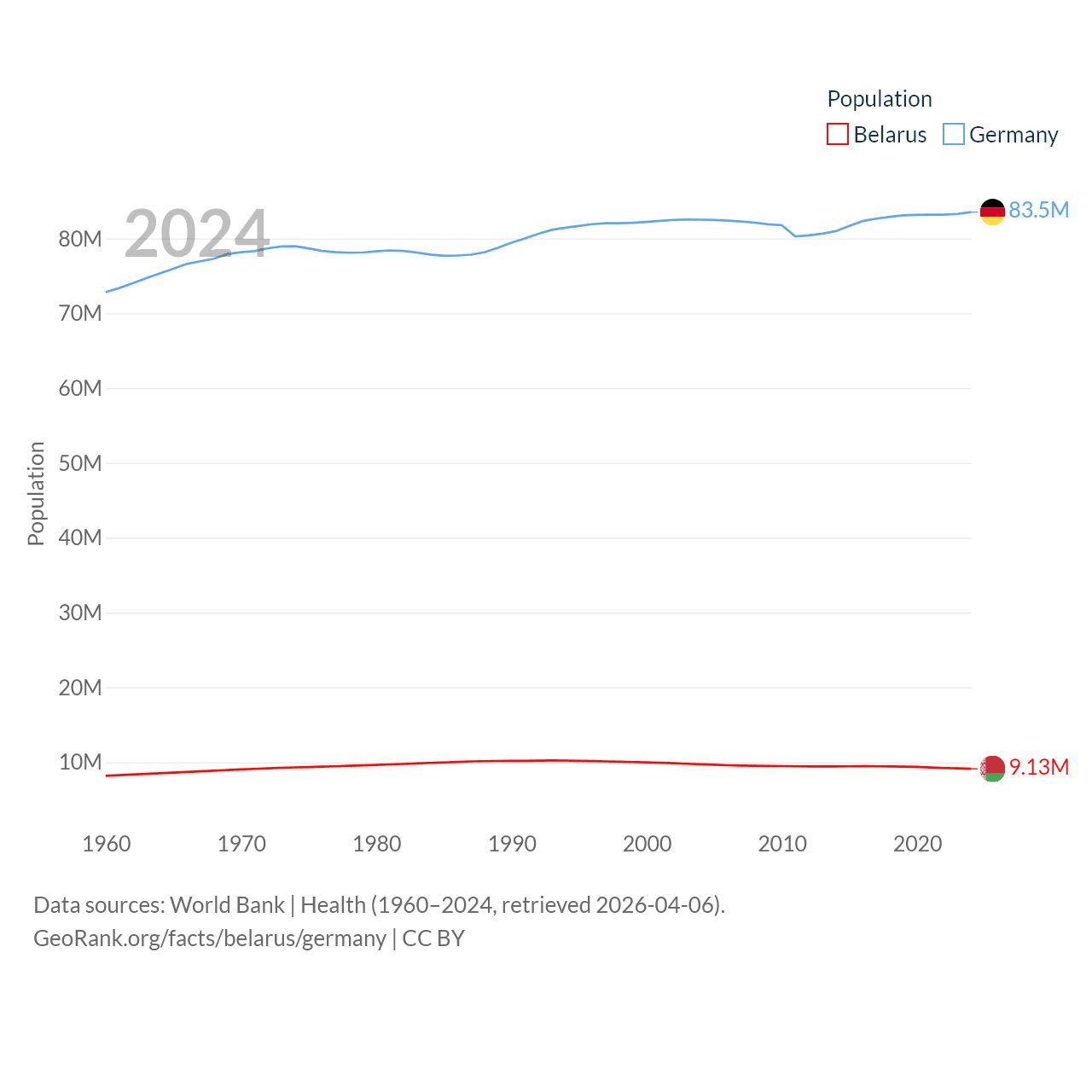 Belarus has a population of 9.13M (ranked 100/197), compared with 83.5M in Germany (ranked 19/197). Belarus' land area is 78,372 sq mi versus 134,916 sq mi for Germany (ranked 83rd vs. 63rd).