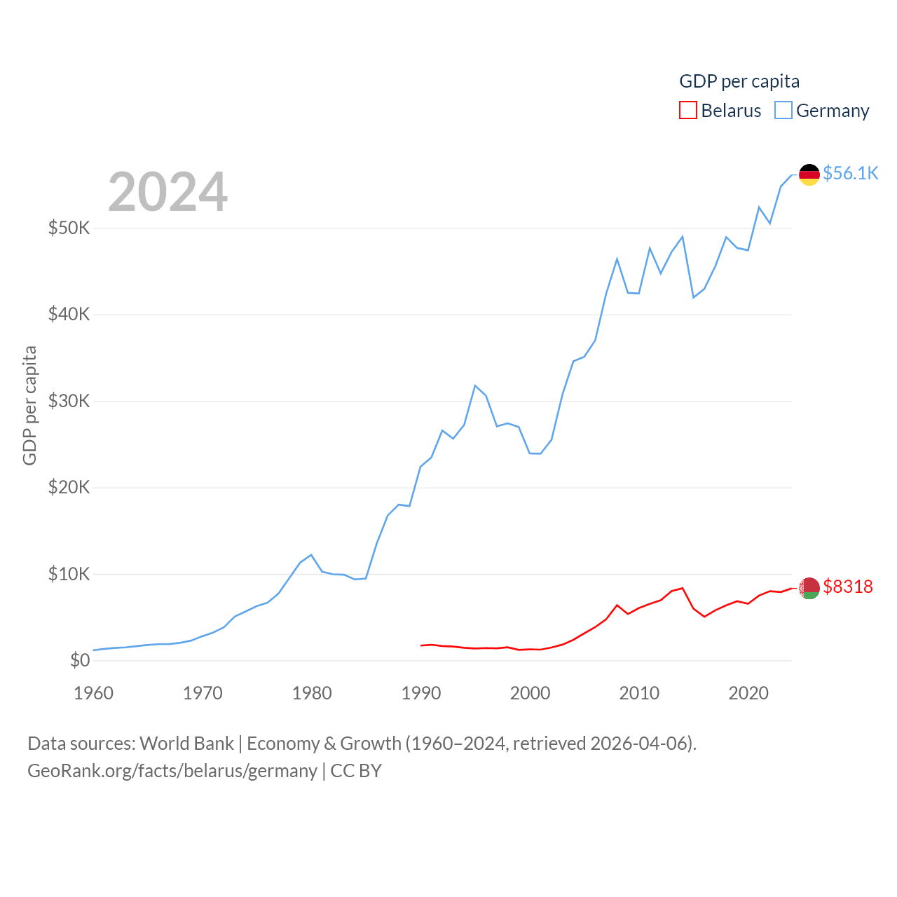 By GDP, Belarus ranks 83/197 ($76B) and Germany ranks 3/197 ($4.69T). By GDP per capita, Belarus ranks 92/197 ($8,318), while Germany ranks 19/197 ($56,104).