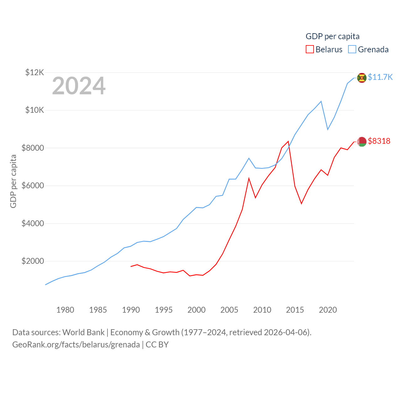 By GDP, Belarus ranks 83/197 ($76B) and Grenada ranks 184/197 ($1.37B). By GDP per capita, Belarus ranks 92/197 ($8,318), while Grenada ranks 80/197 ($11,705).