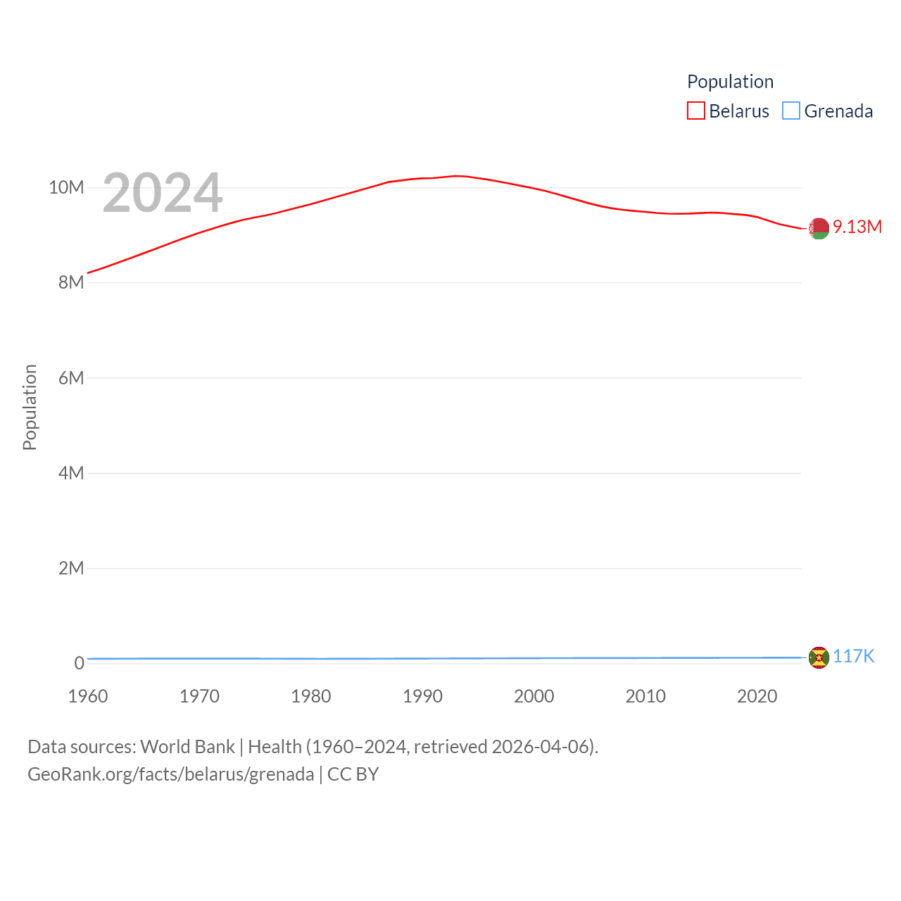 Belarus has a population of 9.13M (ranked 100/197), compared with 117K in Grenada (ranked 182/197). Belarus' land area is 78,372 sq mi versus 131.3 sq mi for Grenada (ranked 83rd vs. 186th).