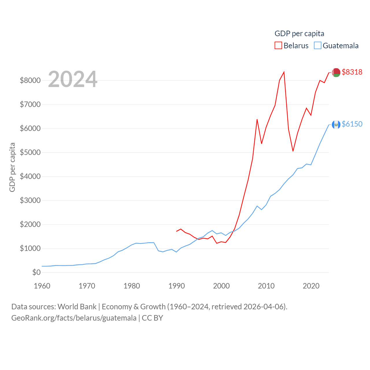 By GDP, Belarus ranks 83/197 ($76B) and Guatemala ranks 68/197 ($113B). By GDP per capita, Belarus ranks 92/197 ($8,318), while Guatemala ranks 112/197 ($6,150).