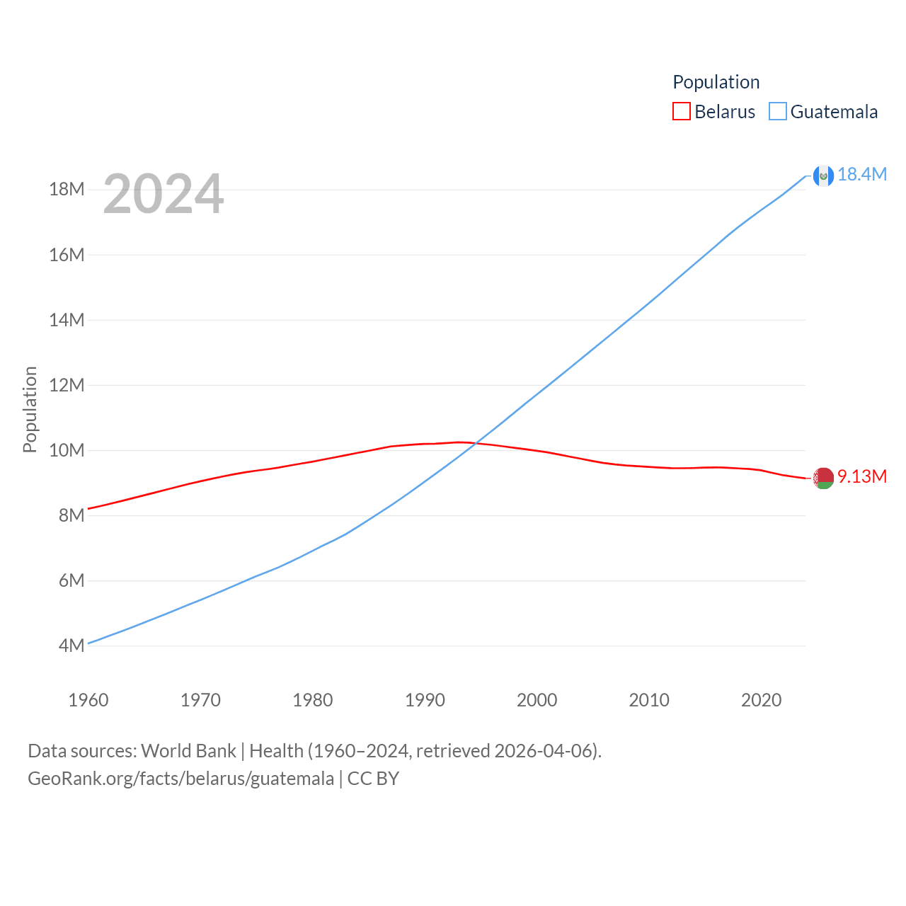 Belarus has a population of 9.13M (ranked 100/197), compared with 18.4M in Guatemala (ranked 70/197). Belarus' land area is 78,372 sq mi versus 41,375 sq mi for Guatemala (ranked 83rd vs. 102nd).