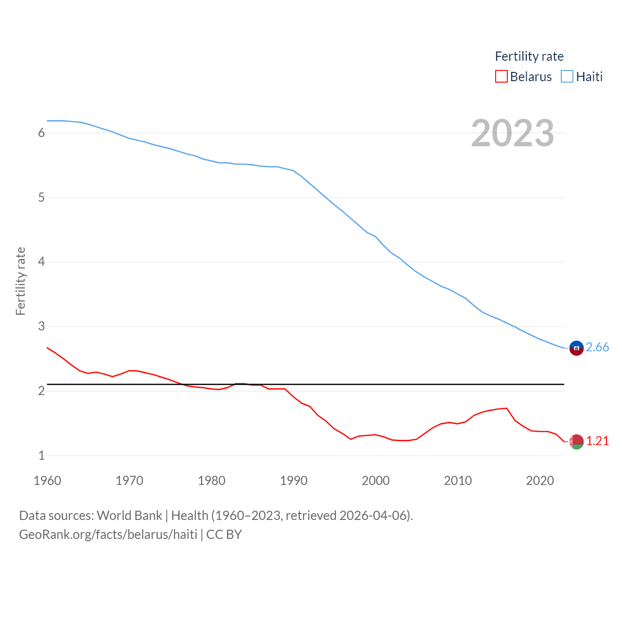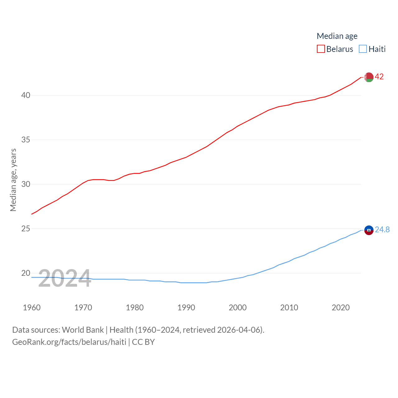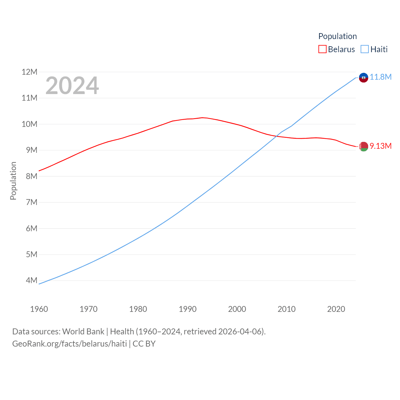 Belarus has a population of 9.13M (ranked 100/197), compared with 11.8M in Haiti (ranked 83/197). Belarus' land area is 78,372 sq mi versus 10,641 sq mi for Haiti (ranked 83rd vs. 142nd).
