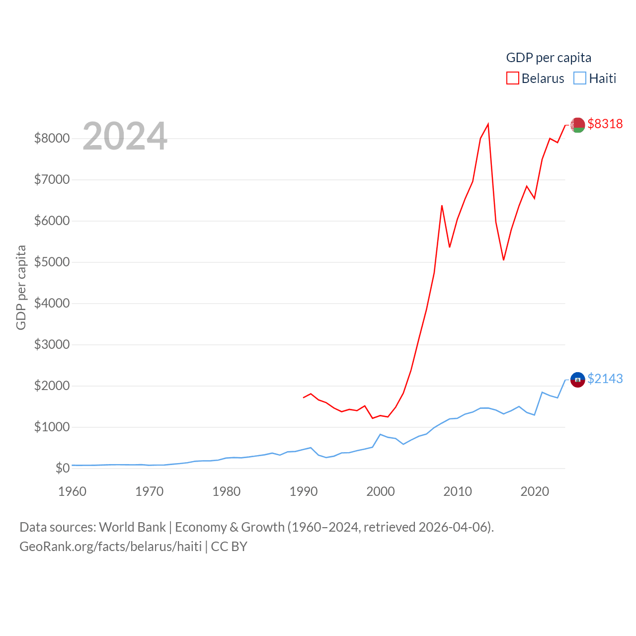 By GDP, Belarus ranks 83/197 ($76B) and Haiti ranks 117/197 ($25.2B). By GDP per capita, Belarus ranks 92/197 ($8,318), while Haiti ranks 153/197 ($2,143).