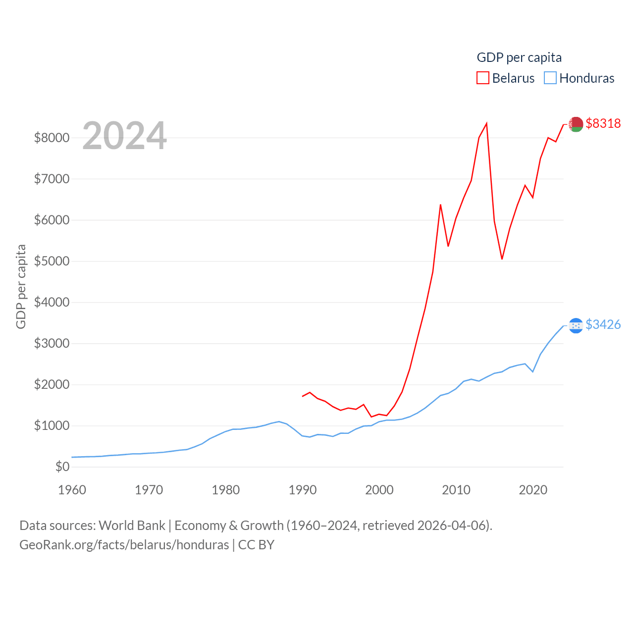 By GDP, Belarus ranks 83/197 ($76B) and Honduras ranks 104/197 ($37.1B). By GDP per capita, Belarus ranks 92/197 ($8,318), while Honduras ranks 136/197 ($3,426).