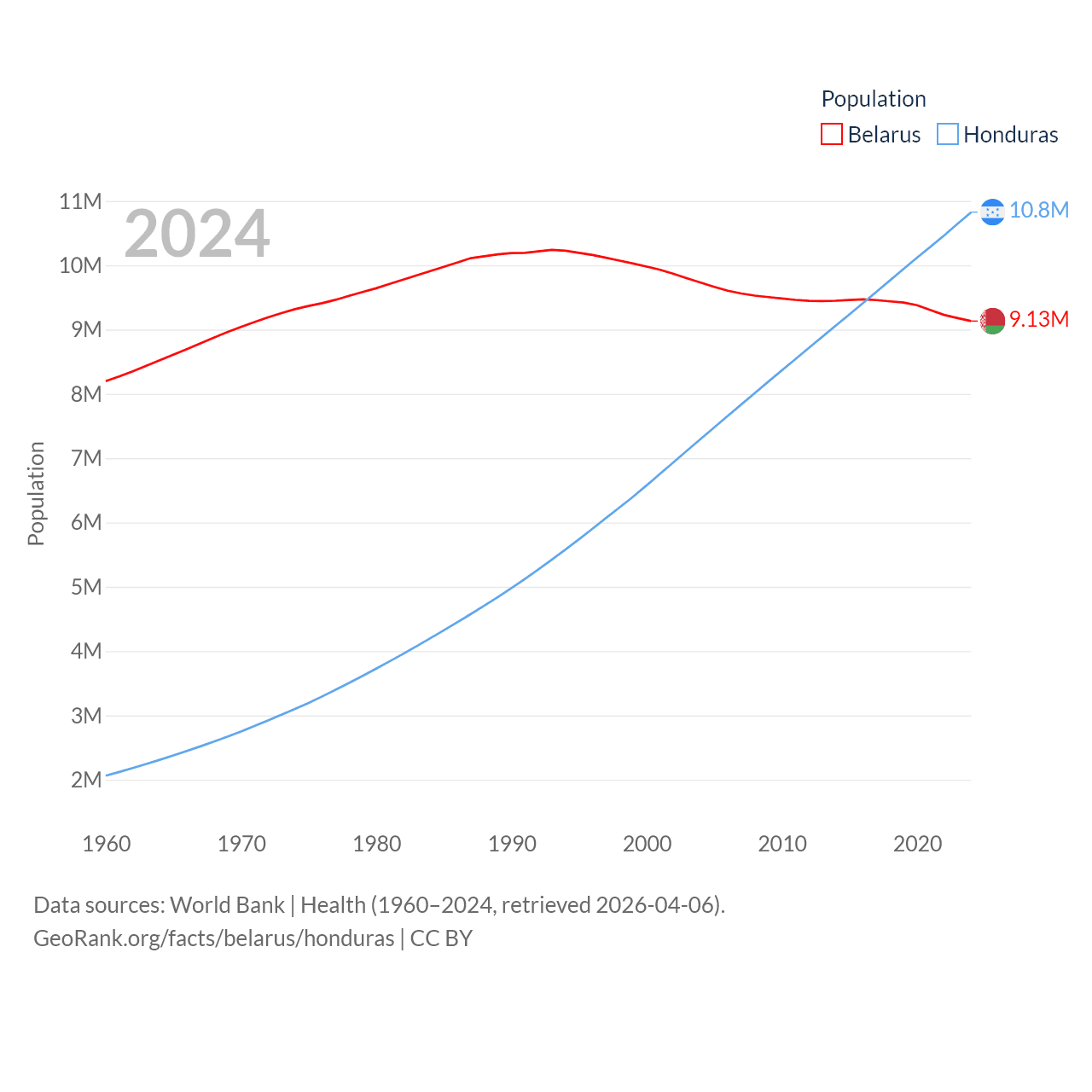 Belarus has a population of 9.13M (ranked 100/197), compared with 10.8M in Honduras (ranked 89/197). Belarus' land area is 78,372 sq mi versus 43,201 sq mi for Honduras (ranked 83rd vs. 100th).