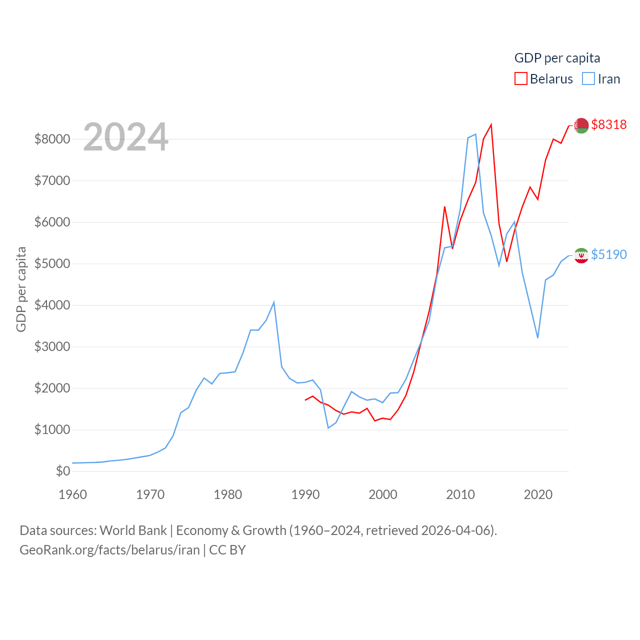By GDP, Belarus ranks 83/197 ($76B) and Iran ranks 34/197 ($475B). By GDP per capita, Belarus ranks 92/197 ($8,318), while Iran ranks 119/197 ($5,190).