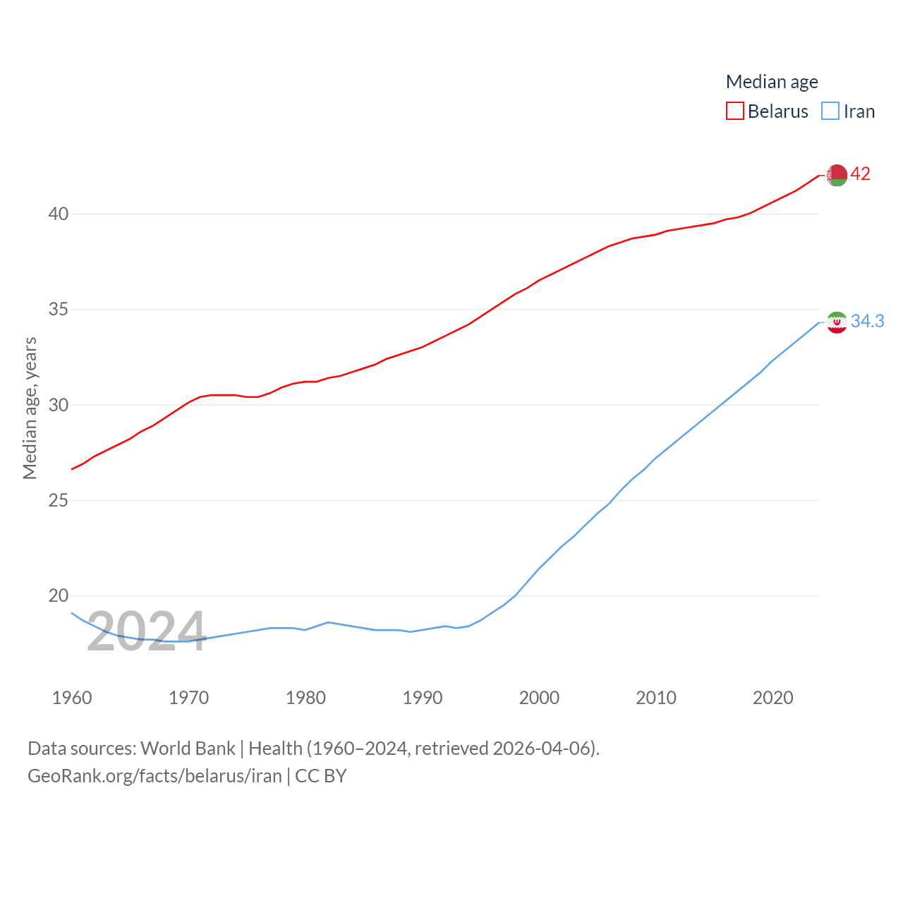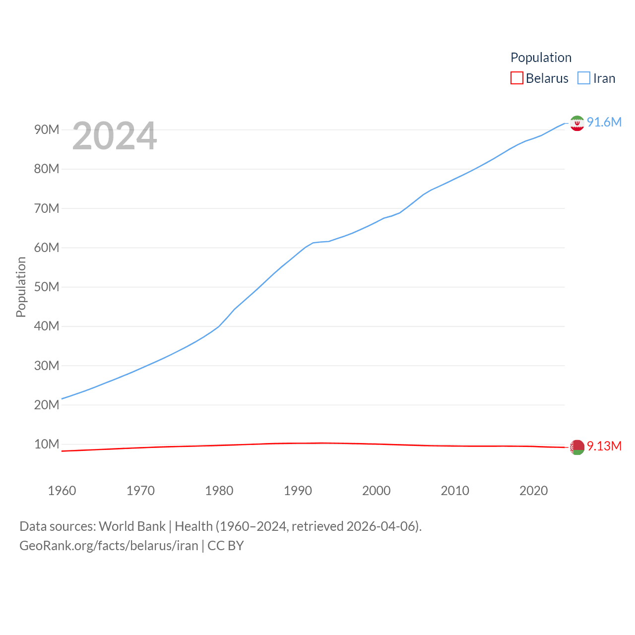 Belarus has a population of 9.13M (ranked 100/197), compared with 91.6M in Iran (ranked 17/197). Belarus' land area is 78,372 sq mi versus 626,451 sq mi for Iran (ranked 83rd vs. 17th).
