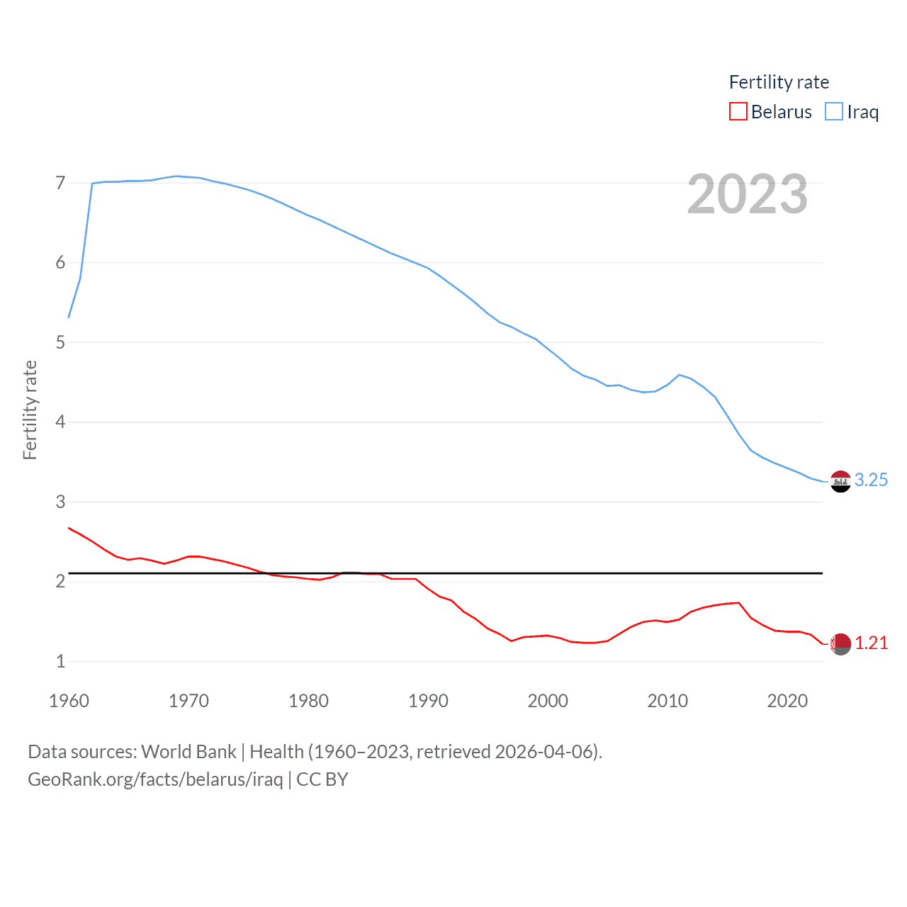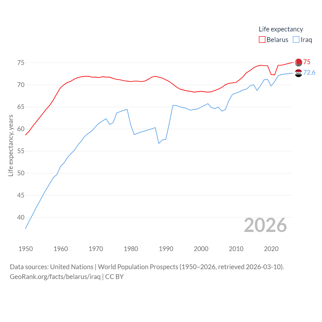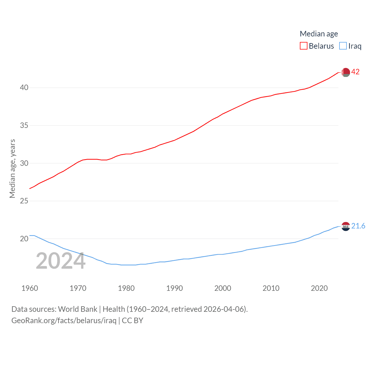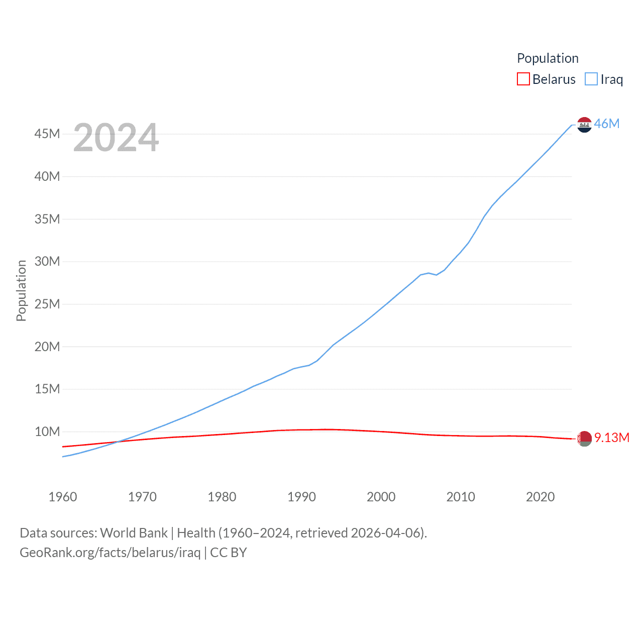 Belarus has a population of 9.13M (ranked 100/197), compared with 46M in Iraq (ranked 34/197). Belarus' land area is 78,372 sq mi versus 167,619 sq mi for Iraq (ranked 83rd vs. 57th).