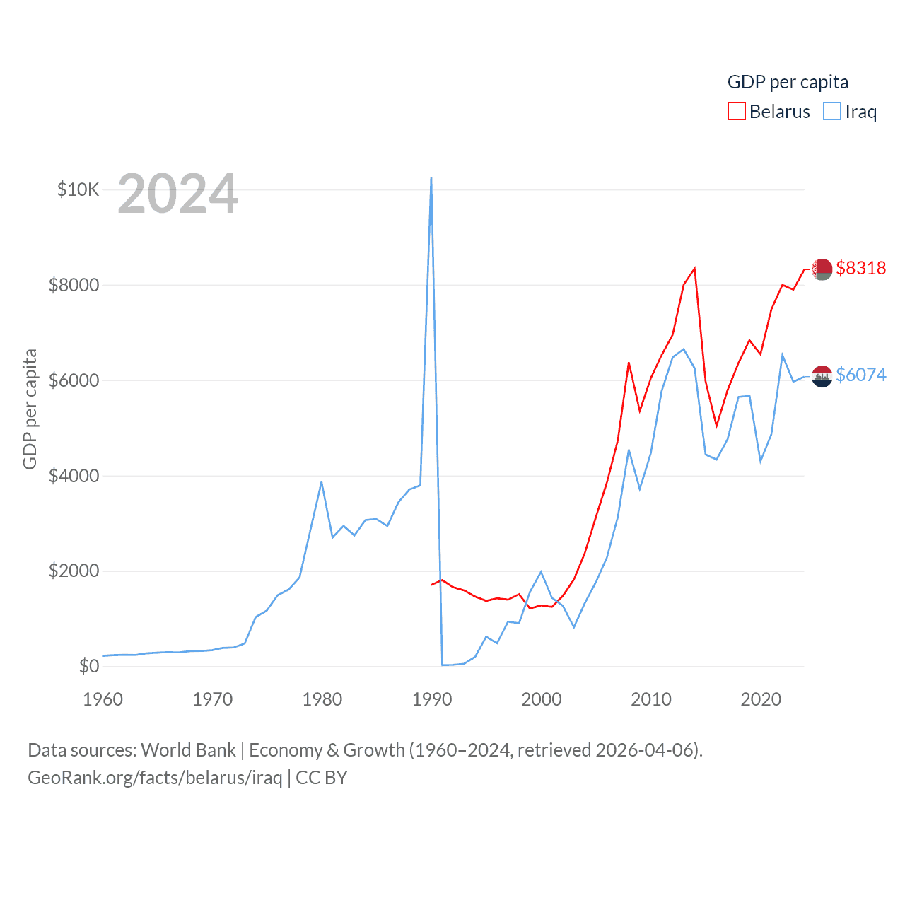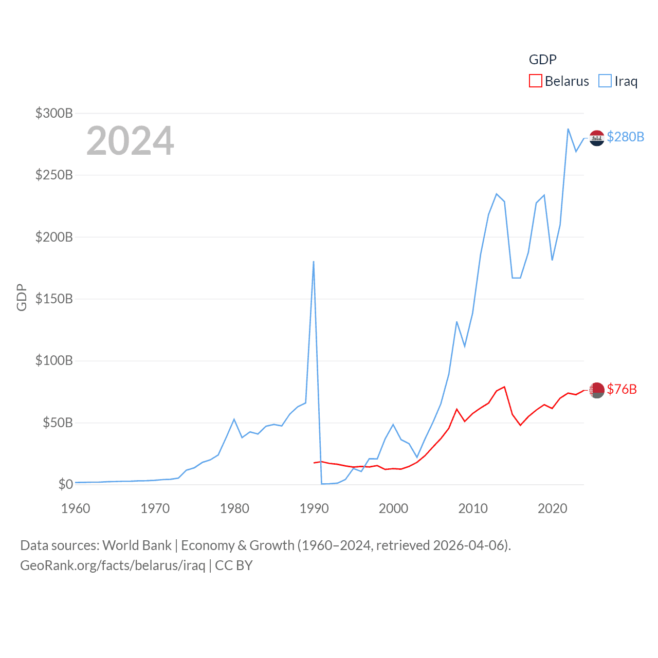 By GDP, Belarus ranks 83/197 ($76B) and Iraq ranks 50/197 ($280B). By GDP per capita, Belarus ranks 92/197 ($8,318), while Iraq ranks 113/197 ($6,074).