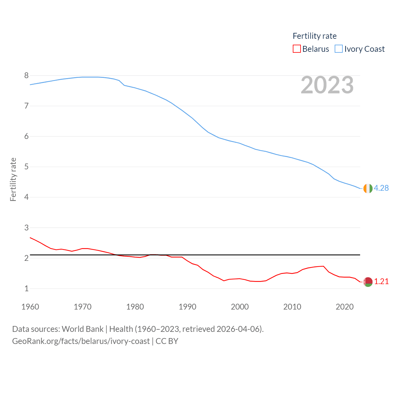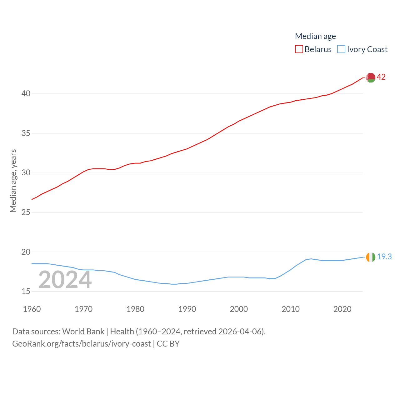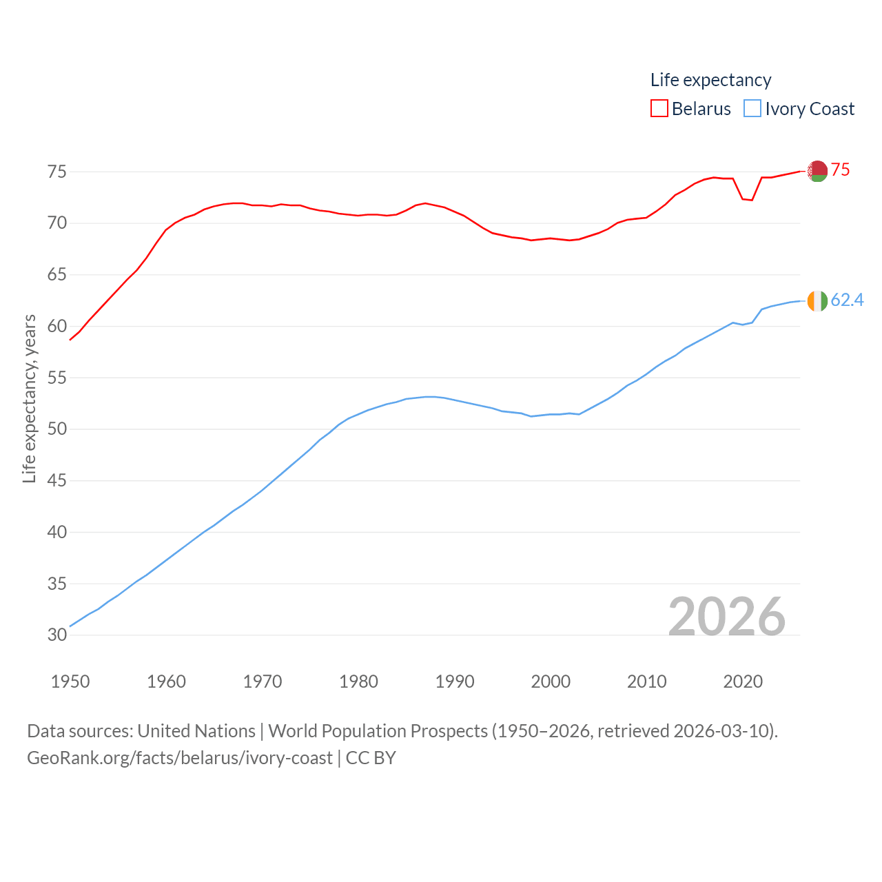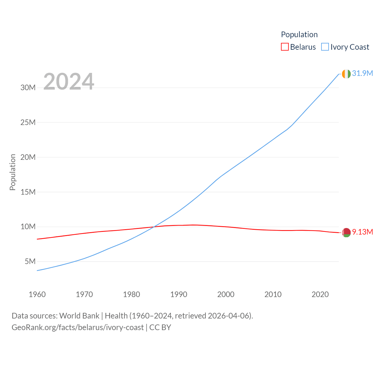Belarus has a population of 9.13M (ranked 100/197), compared with 31.9M in Ivory Coast (ranked 50/197). Belarus' land area is 78,372 sq mi versus 122,780 sq mi for Ivory Coast (ranked 83rd vs. 66th).