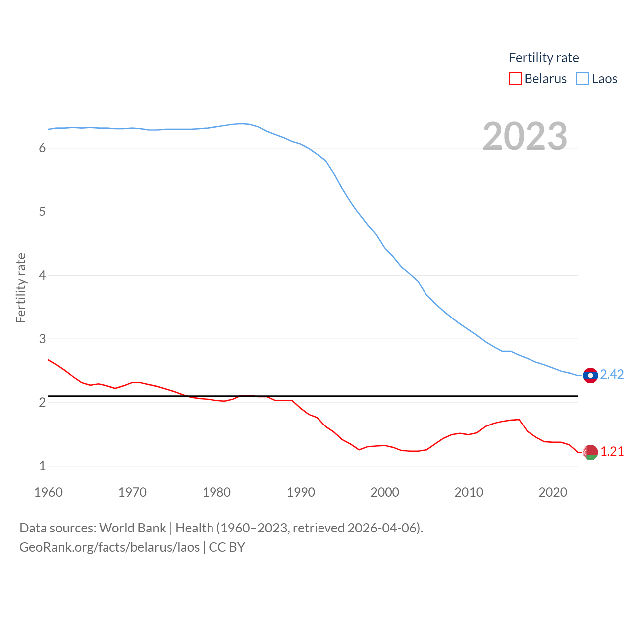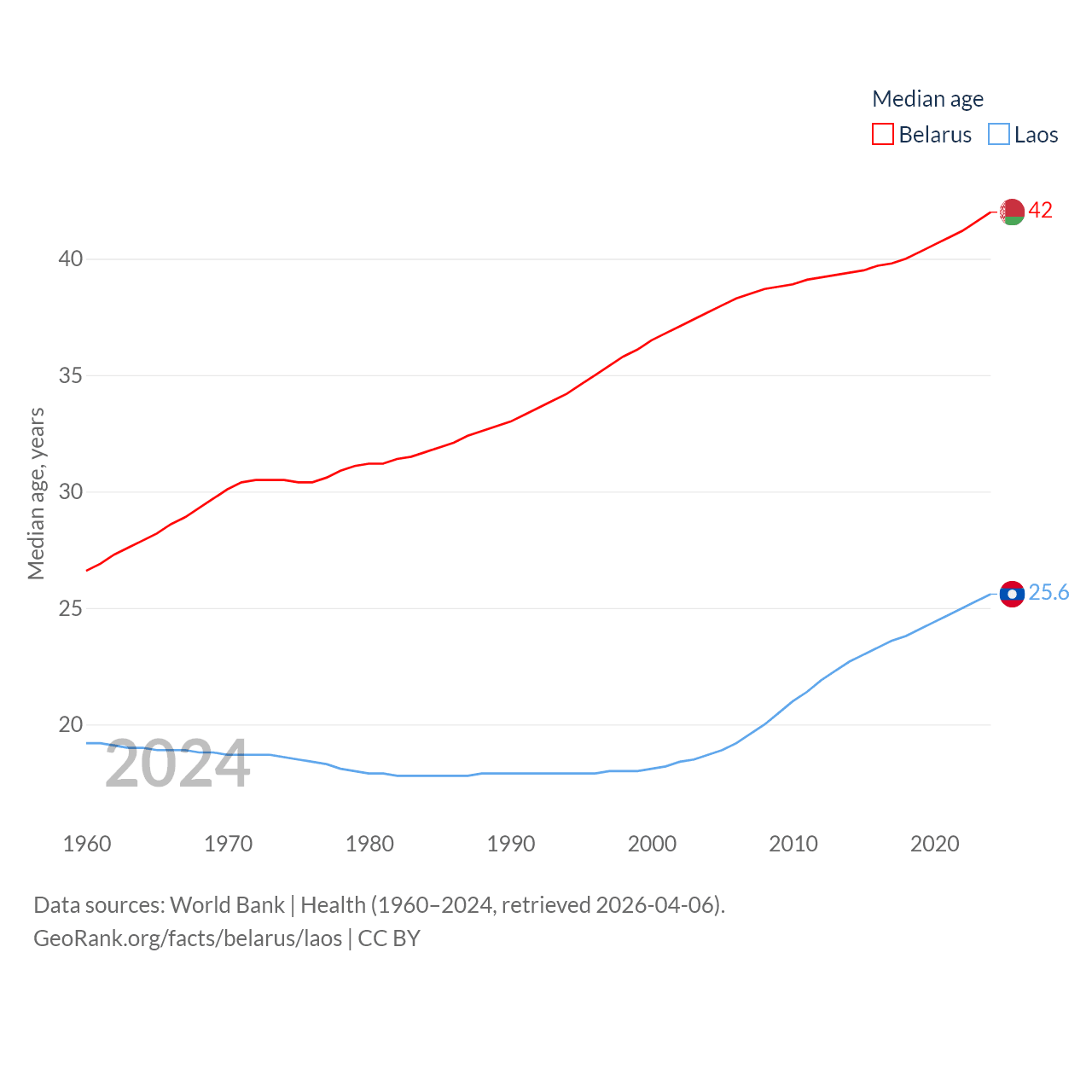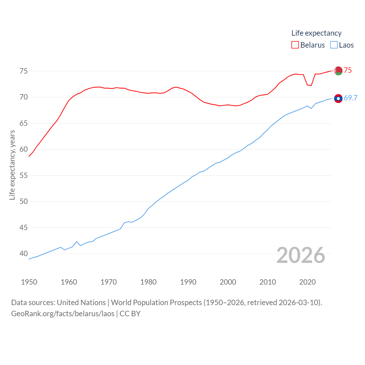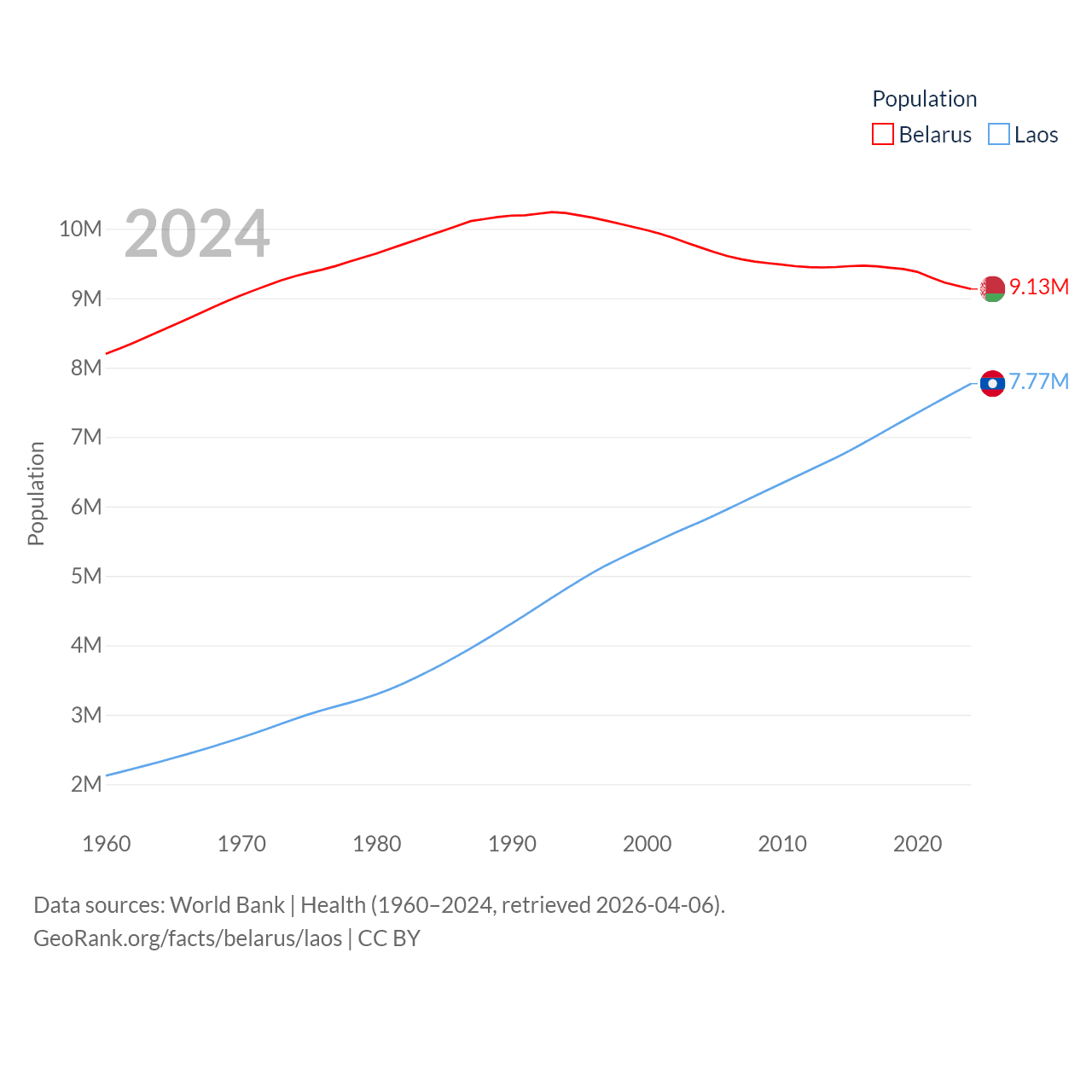 Belarus has a population of 9.13M (ranked 100/197), compared with 7.77M in Laos (ranked 103/197). Belarus' land area is 78,372 sq mi versus 89,112 sq mi for Laos (ranked 83rd vs. 79th).