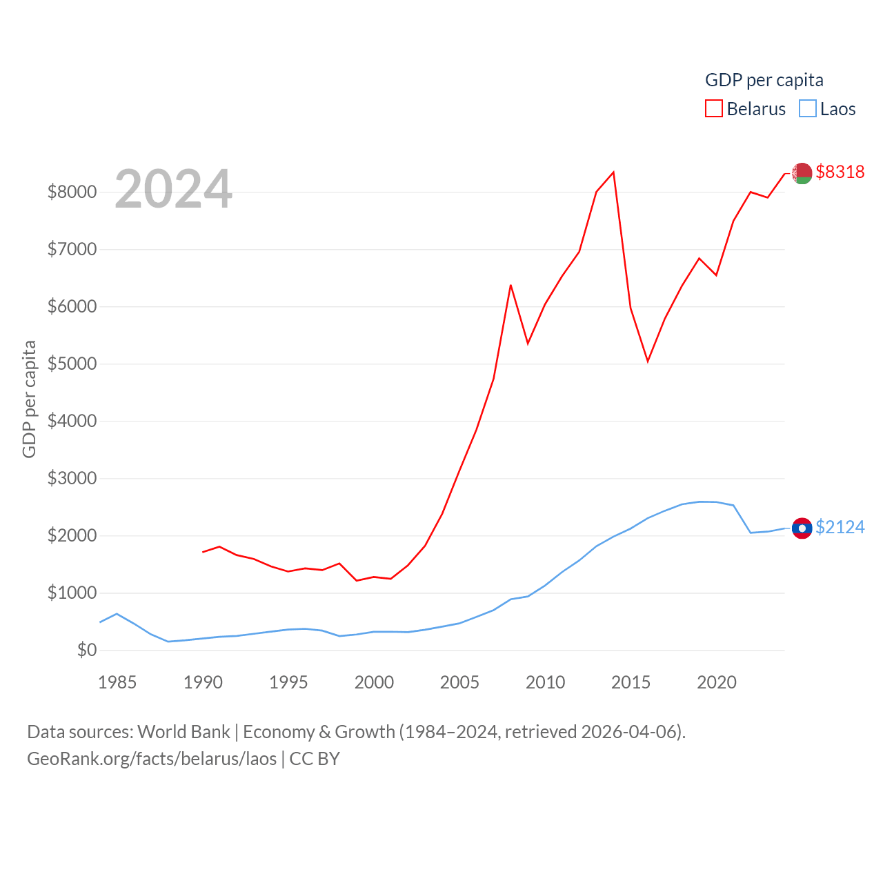 By GDP, Belarus ranks 83/197 ($76B) and Laos ranks 139/197 ($16.5B). By GDP per capita, Belarus ranks 92/197 ($8,318), while Laos ranks 155/197 ($2,124).
