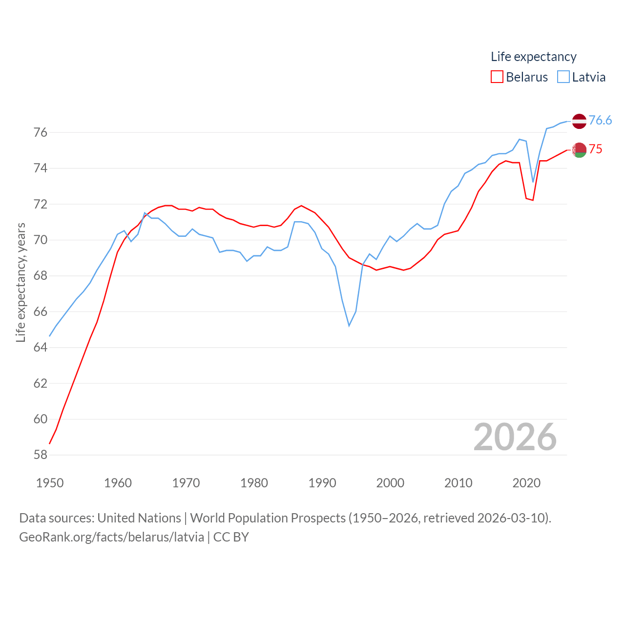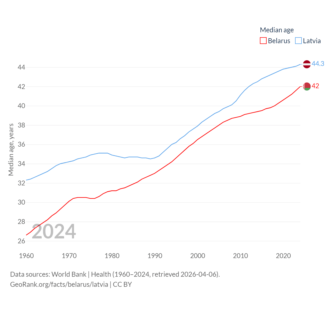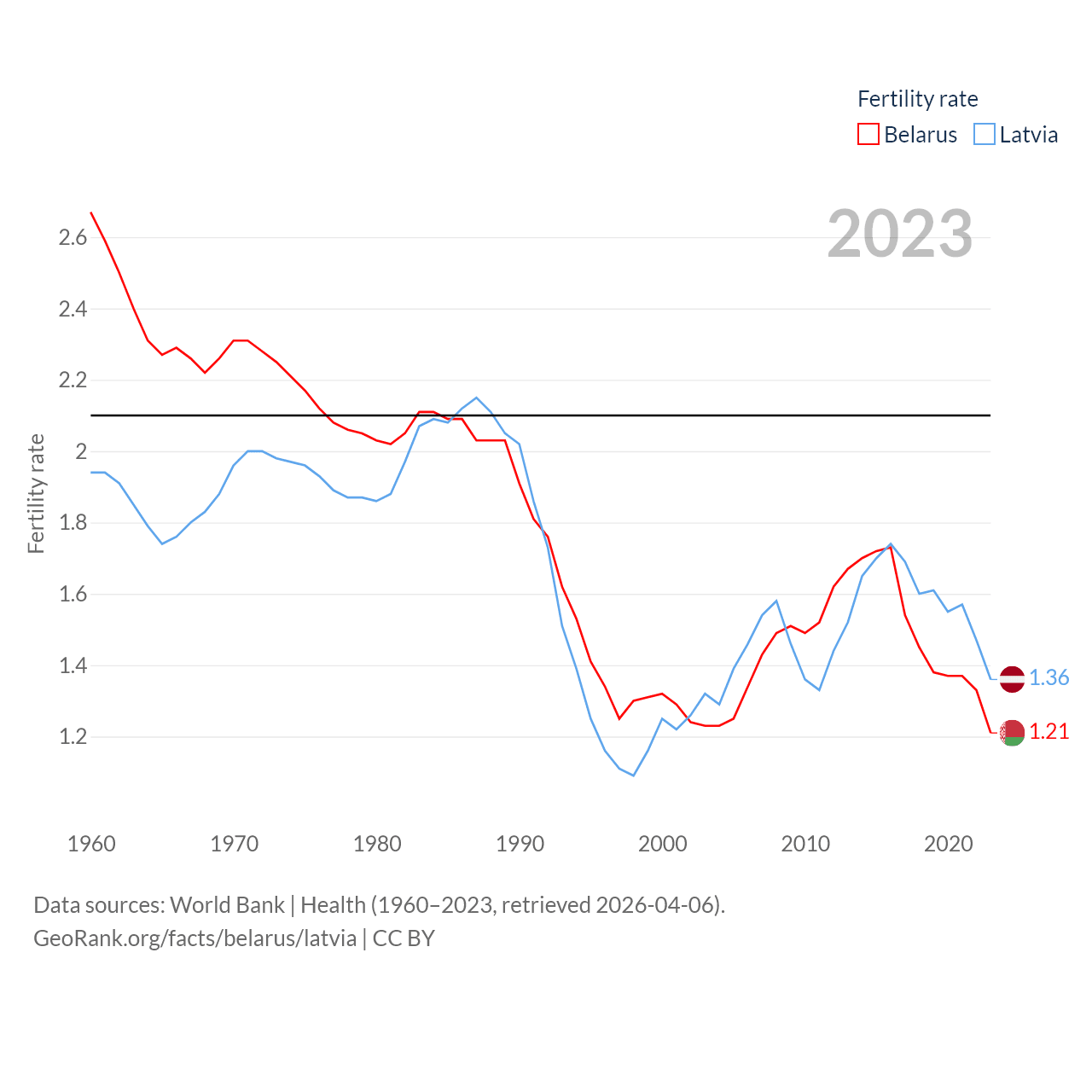 Belarus has a population of 9.13M (ranked 100/197), compared with 1.87M in Latvia (ranked 149/197). Belarus' land area is 78,372 sq mi versus 24,027 sq mi for Latvia (ranked 83rd vs. 121st).