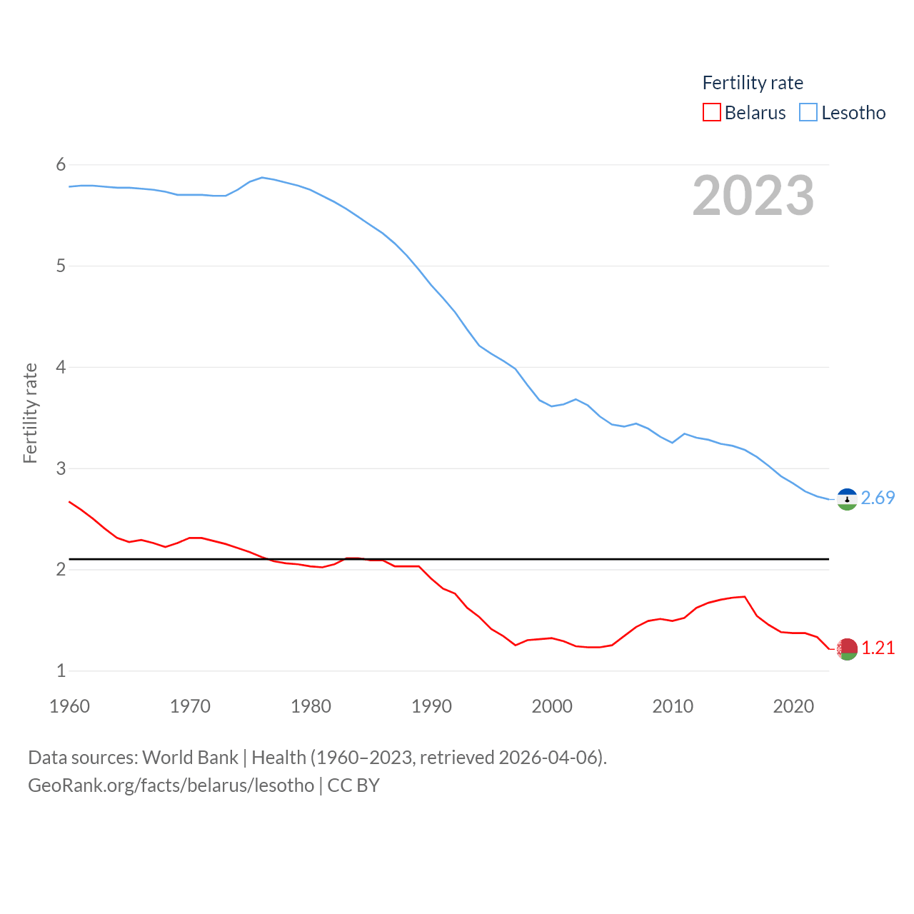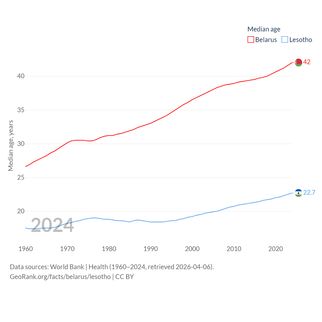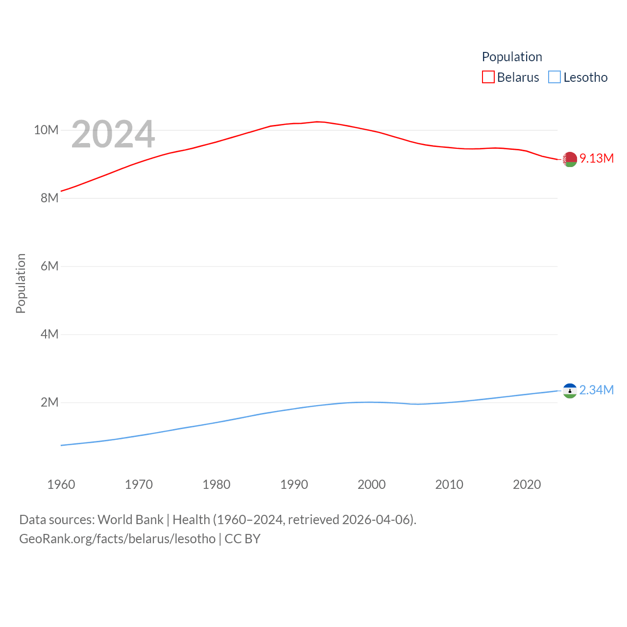 Belarus has a population of 9.13M (ranked 100/197), compared with 2.34M in Lesotho (ranked 145/197). Belarus' land area is 78,372 sq mi versus 11,722 sq mi for Lesotho (ranked 83rd vs. 137th).