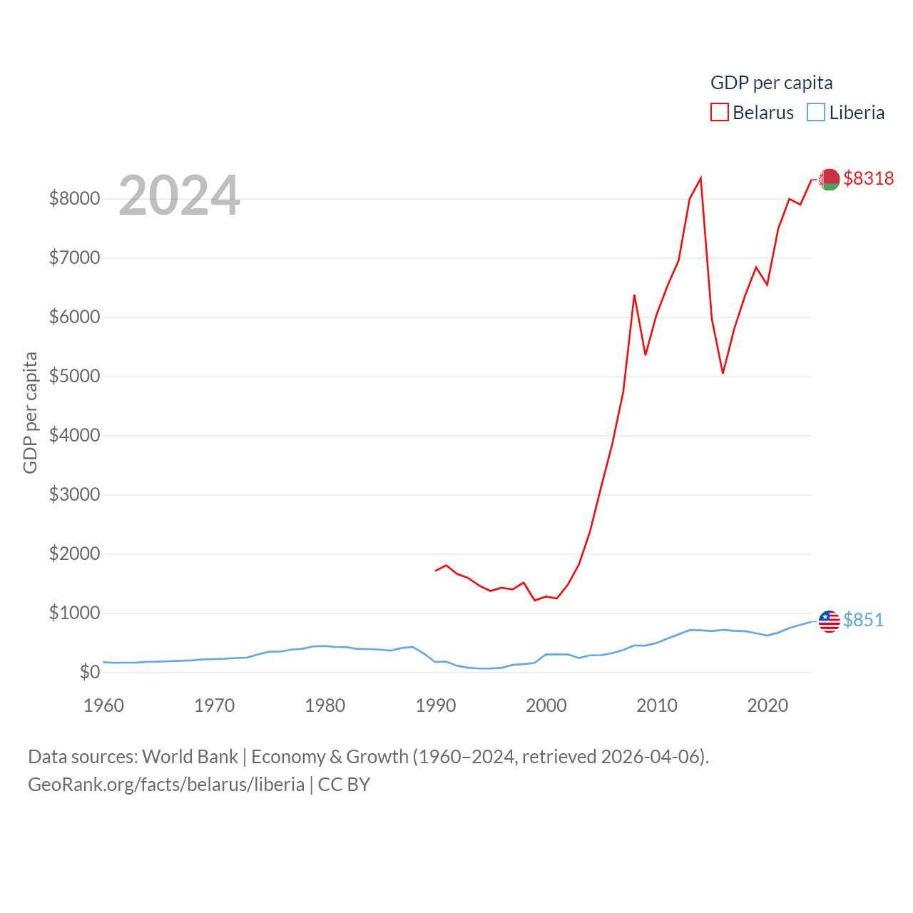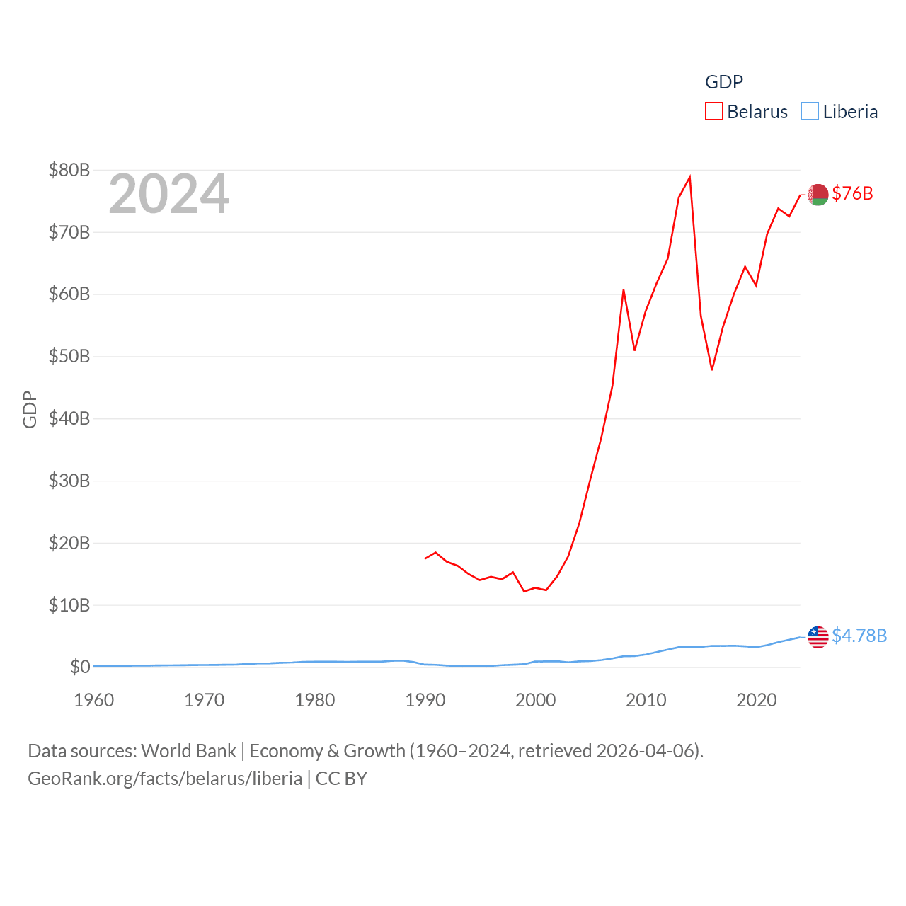 By GDP, Belarus ranks 83/197 ($76B) and Liberia ranks 163/197 ($4.78B). By GDP per capita, Belarus ranks 92/197 ($8,318), while Liberia ranks 184/197 ($851).