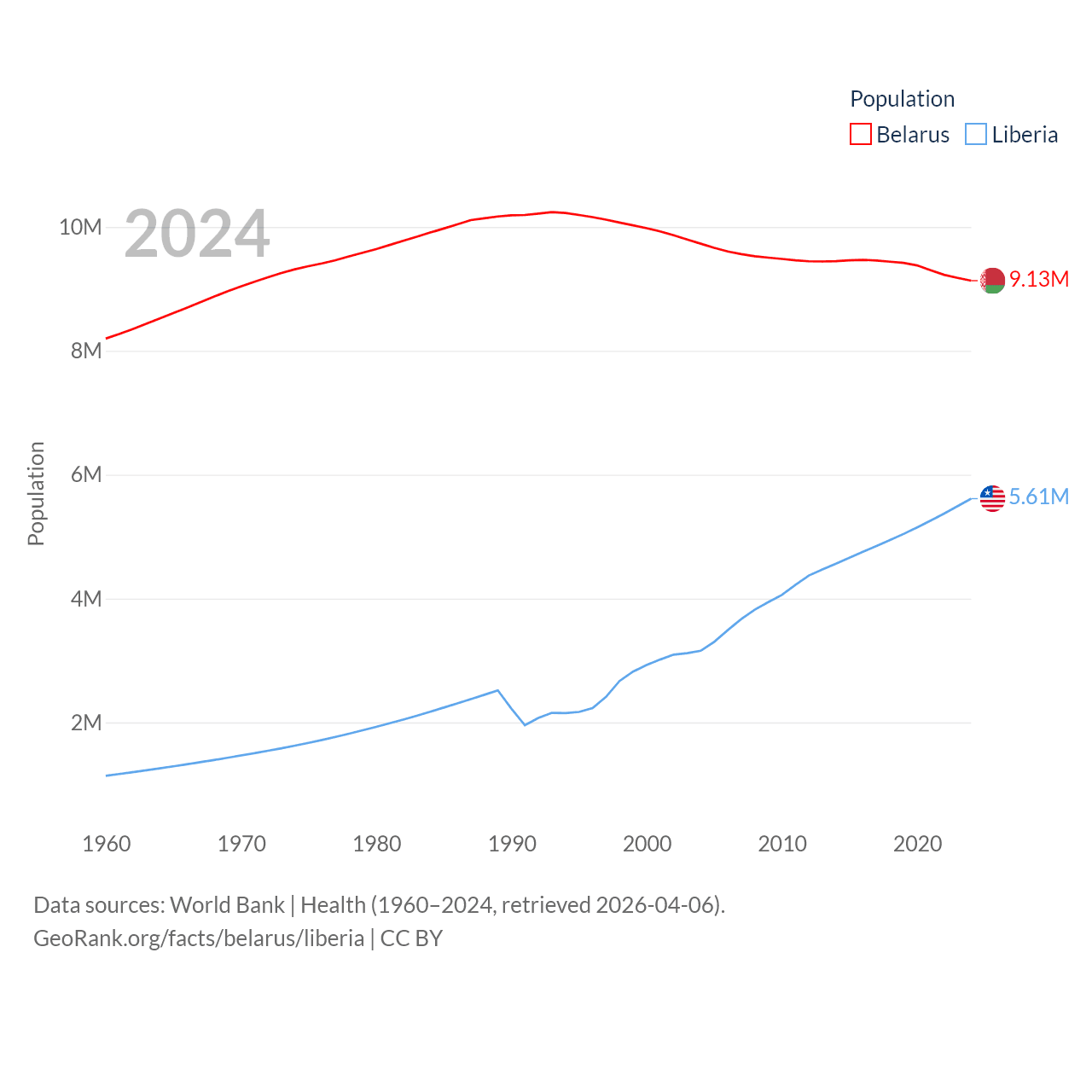 Belarus has a population of 9.13M (ranked 100/197), compared with 5.61M in Liberia (ranked 117/197). Belarus' land area is 78,372 sq mi versus 37,189 sq mi for Liberia (ranked 83rd vs. 106th).