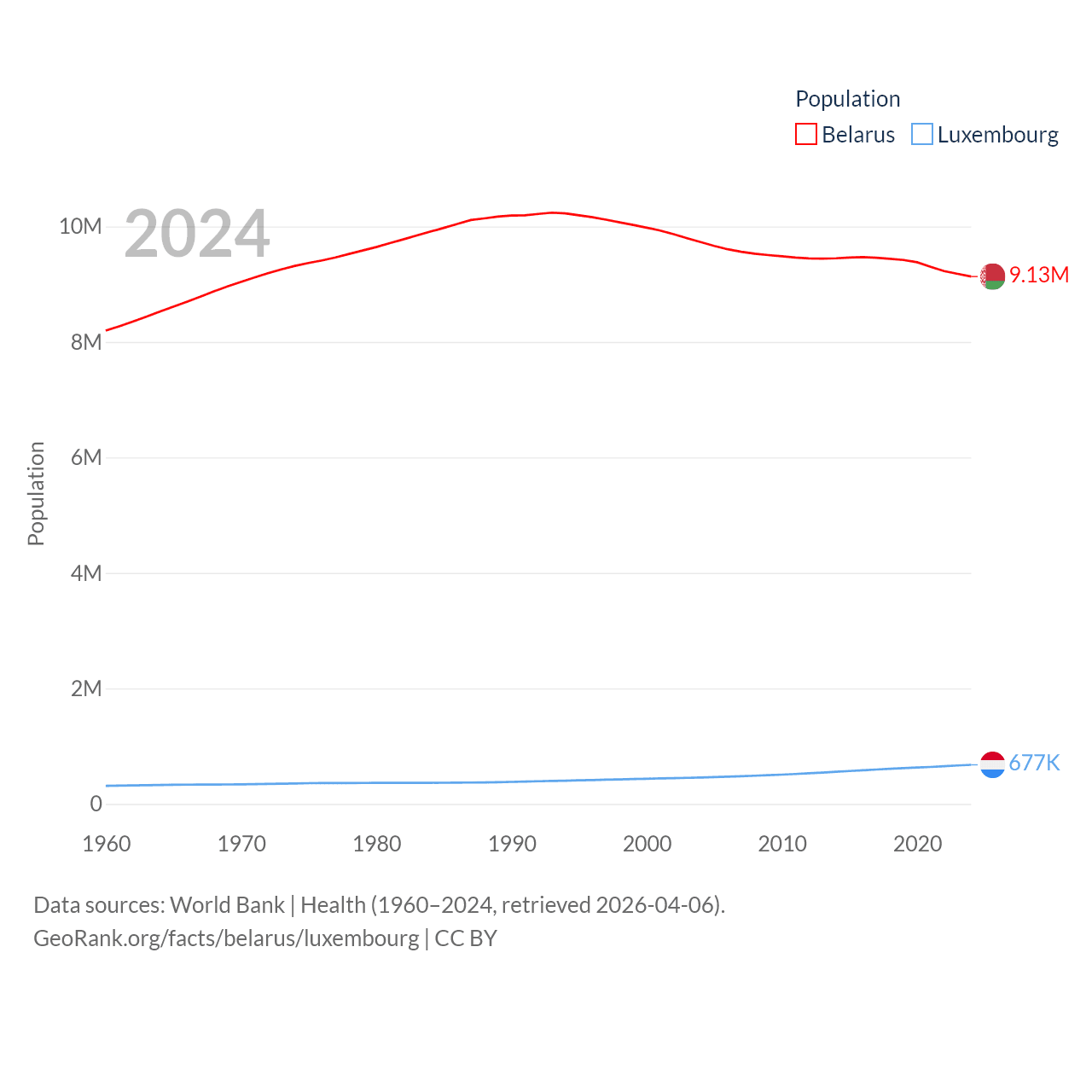 Belarus has a population of 9.13M (ranked 100/197), compared with 677K in Luxembourg (ranked 164/197). Belarus' land area is 78,372 sq mi versus 994 sq mi for Luxembourg (ranked 83rd vs. 169th).
