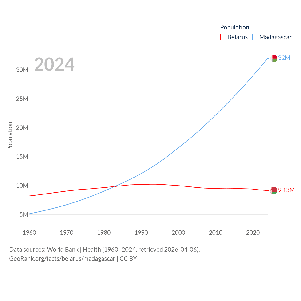 Belarus has a population of 9.13M (ranked 100/197), compared with 32M in Madagascar (ranked 49/197). Belarus' land area is 78,372 sq mi versus 224,634 sq mi for Madagascar (ranked 83rd vs. 44th).