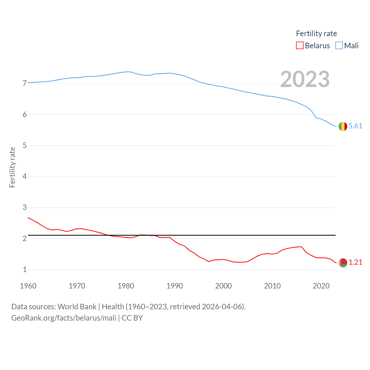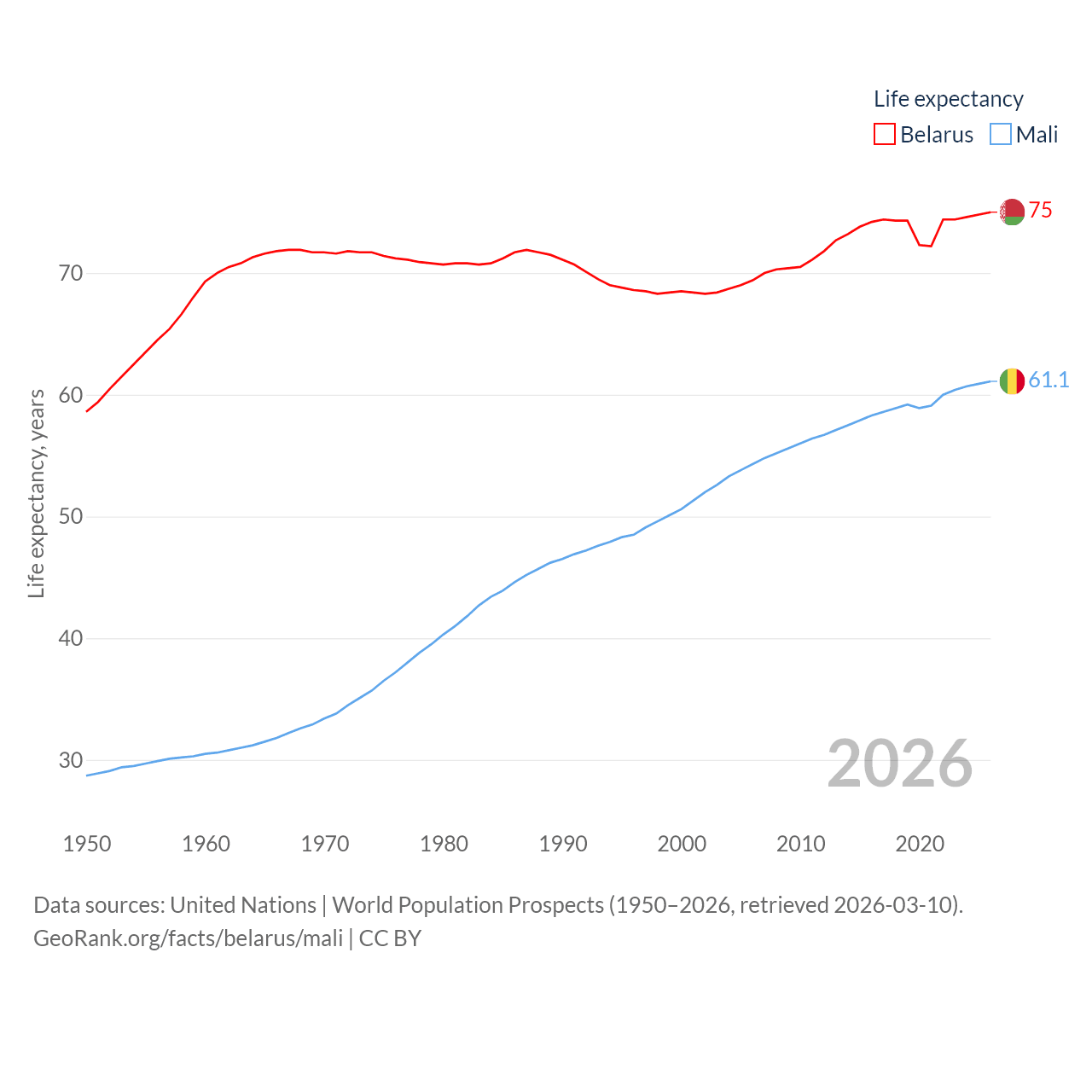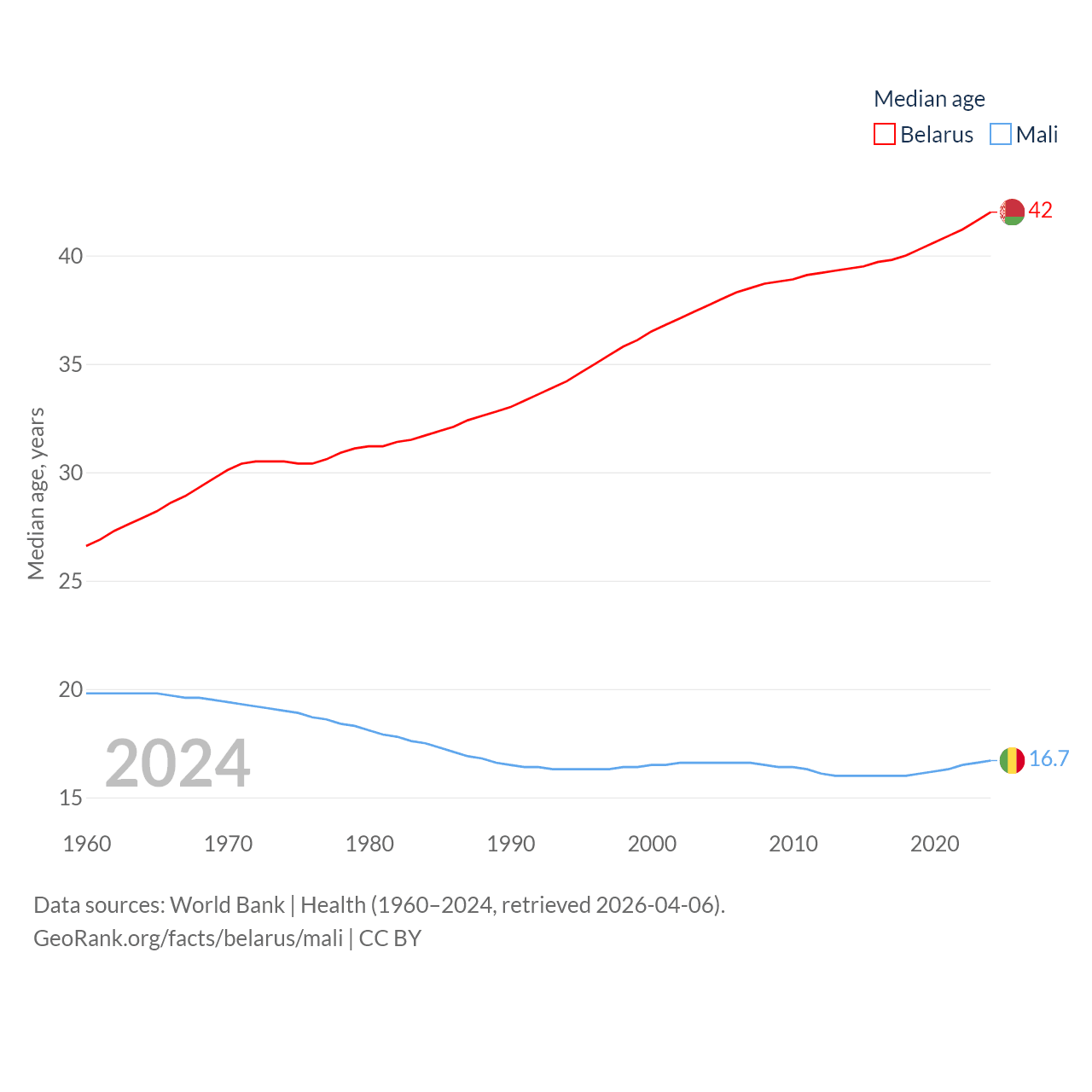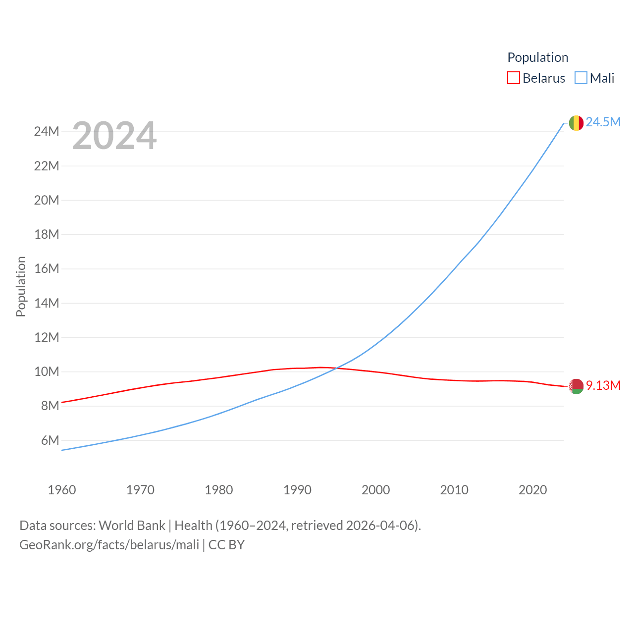 Belarus has a population of 9.13M (ranked 100/197), compared with 24.5M in Mali (ranked 58/197). Belarus' land area is 78,372 sq mi versus 471,118 sq mi for Mali (ranked 83rd vs. 23rd).