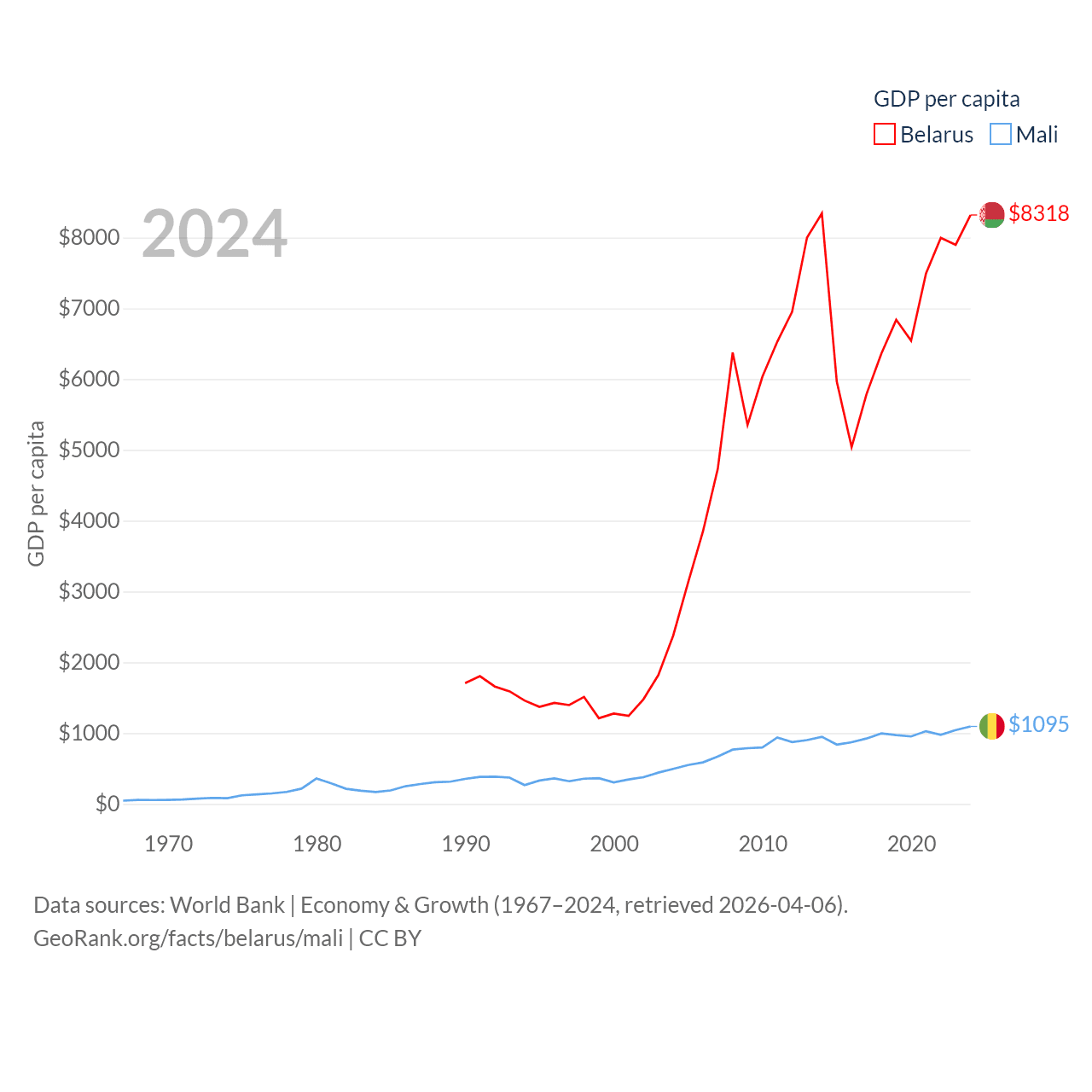 By GDP, Belarus ranks 83/197 ($76B) and Mali ranks 113/197 ($26.8B). By GDP per capita, Belarus ranks 92/197 ($8,318), while Mali ranks 173/197 ($1,095).