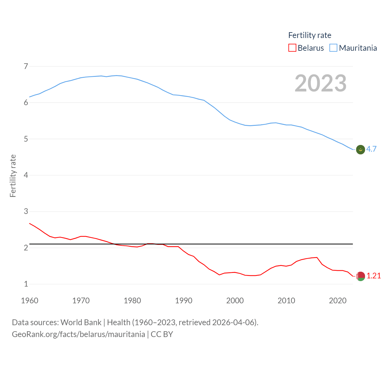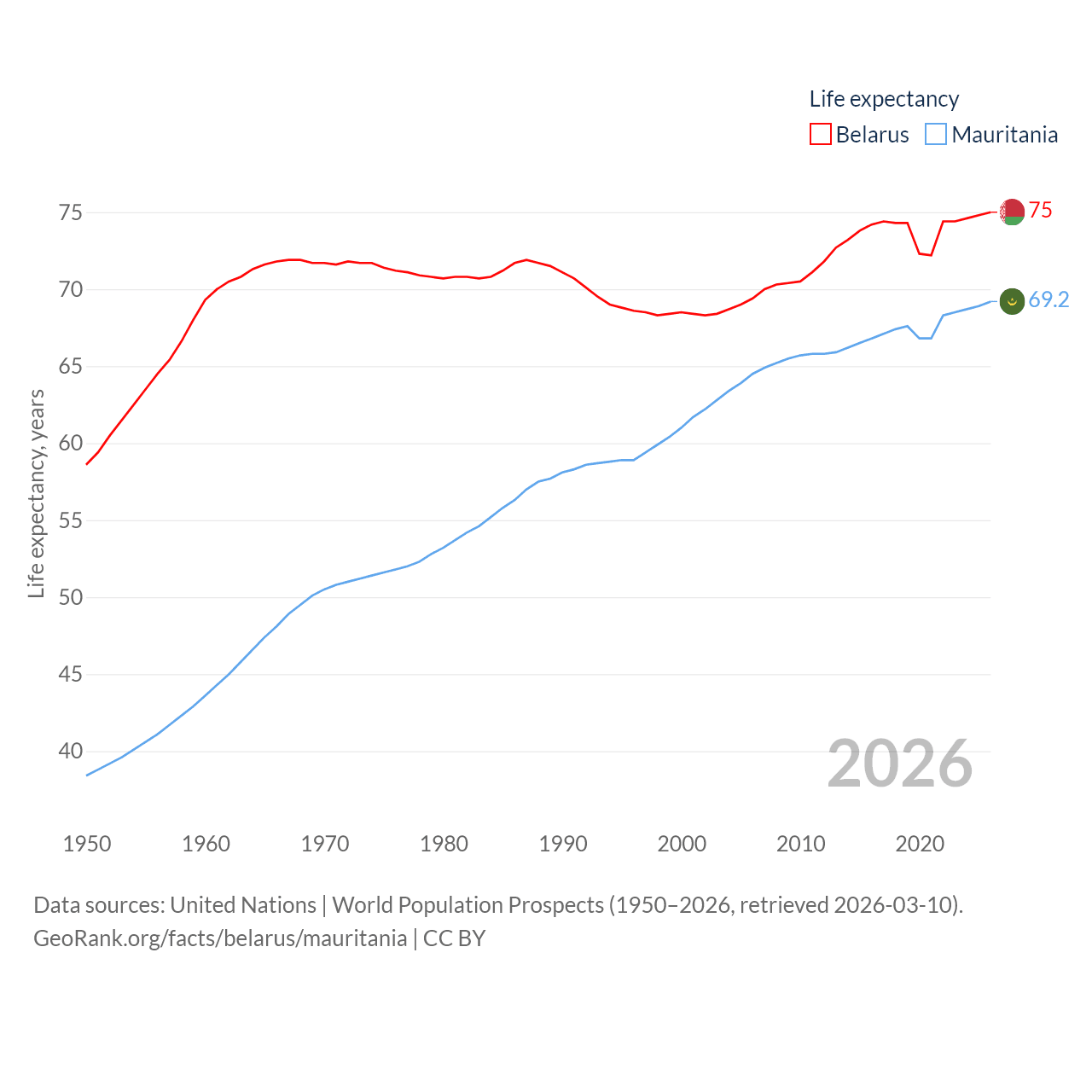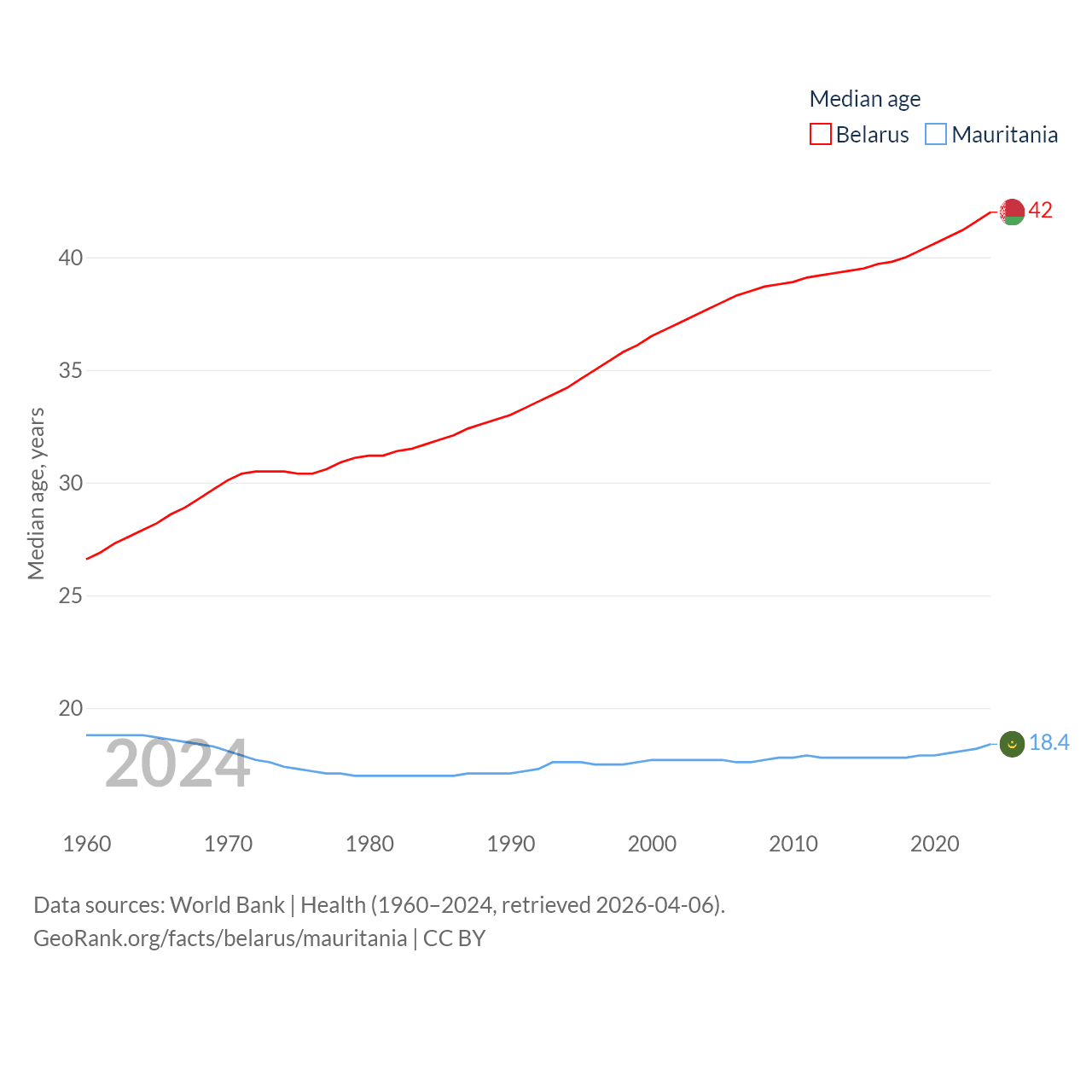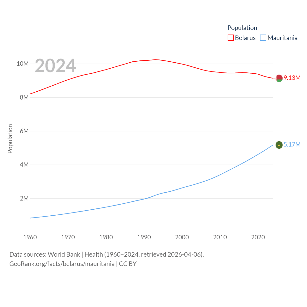 Belarus has a population of 9.13M (ranked 100/197), compared with 5.17M in Mauritania (ranked 125/197). Belarus' land area is 78,372 sq mi versus 397,955 sq mi for Mauritania (ranked 83rd vs. 28th).