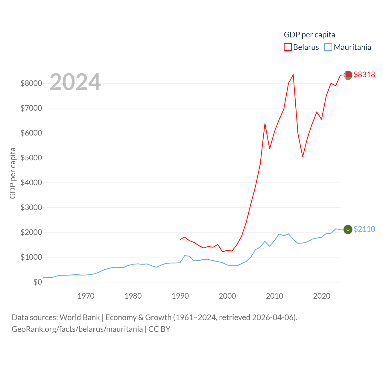 By GDP, Belarus ranks 83/197 ($76B) and Mauritania ranks 153/197 ($10.9B). By GDP per capita, Belarus ranks 92/197 ($8,318), while Mauritania ranks 156/197 ($2,110).