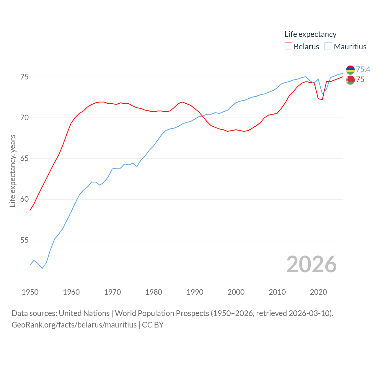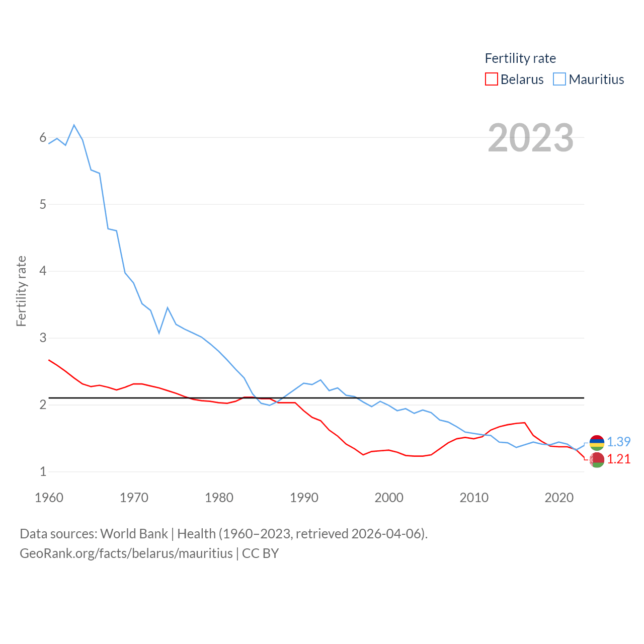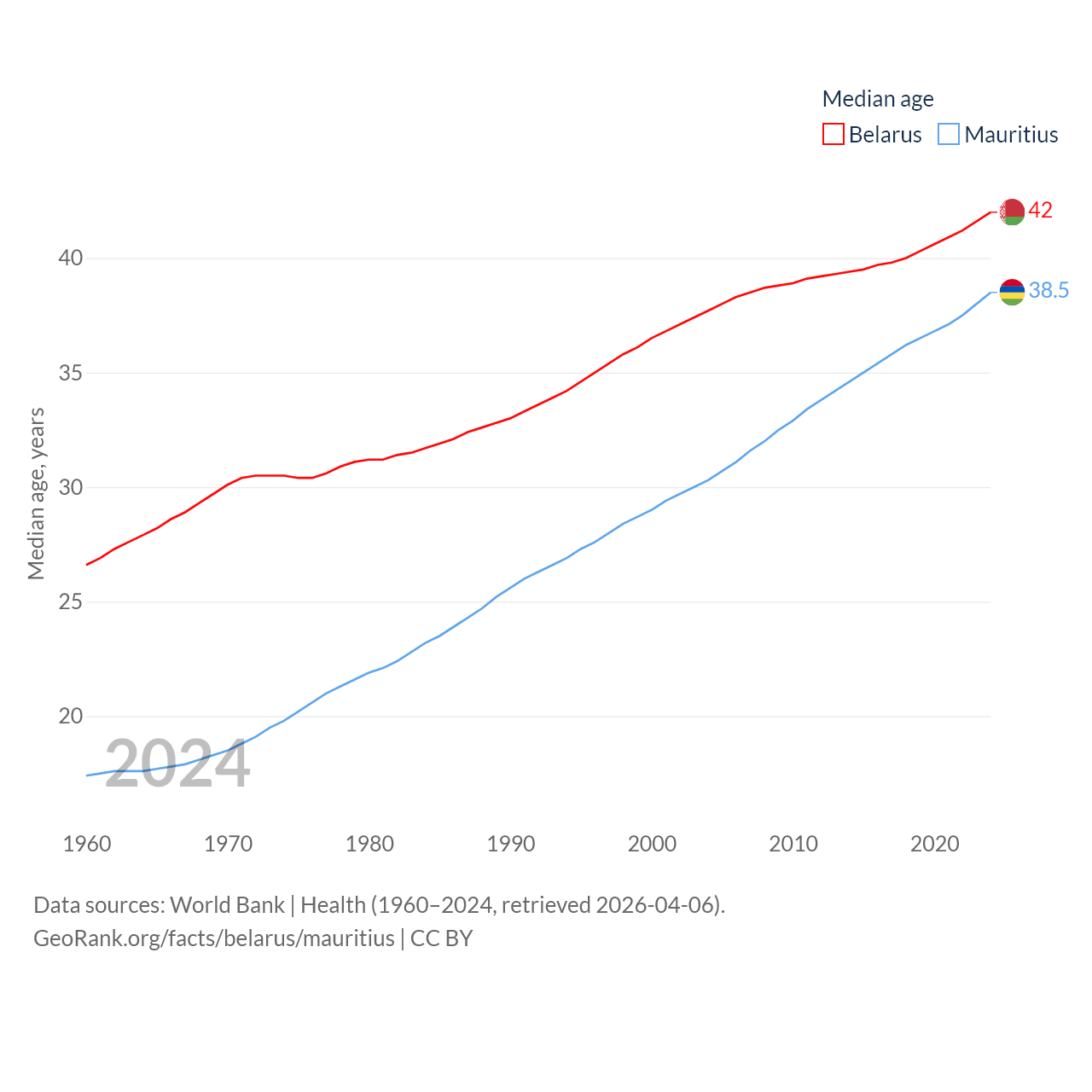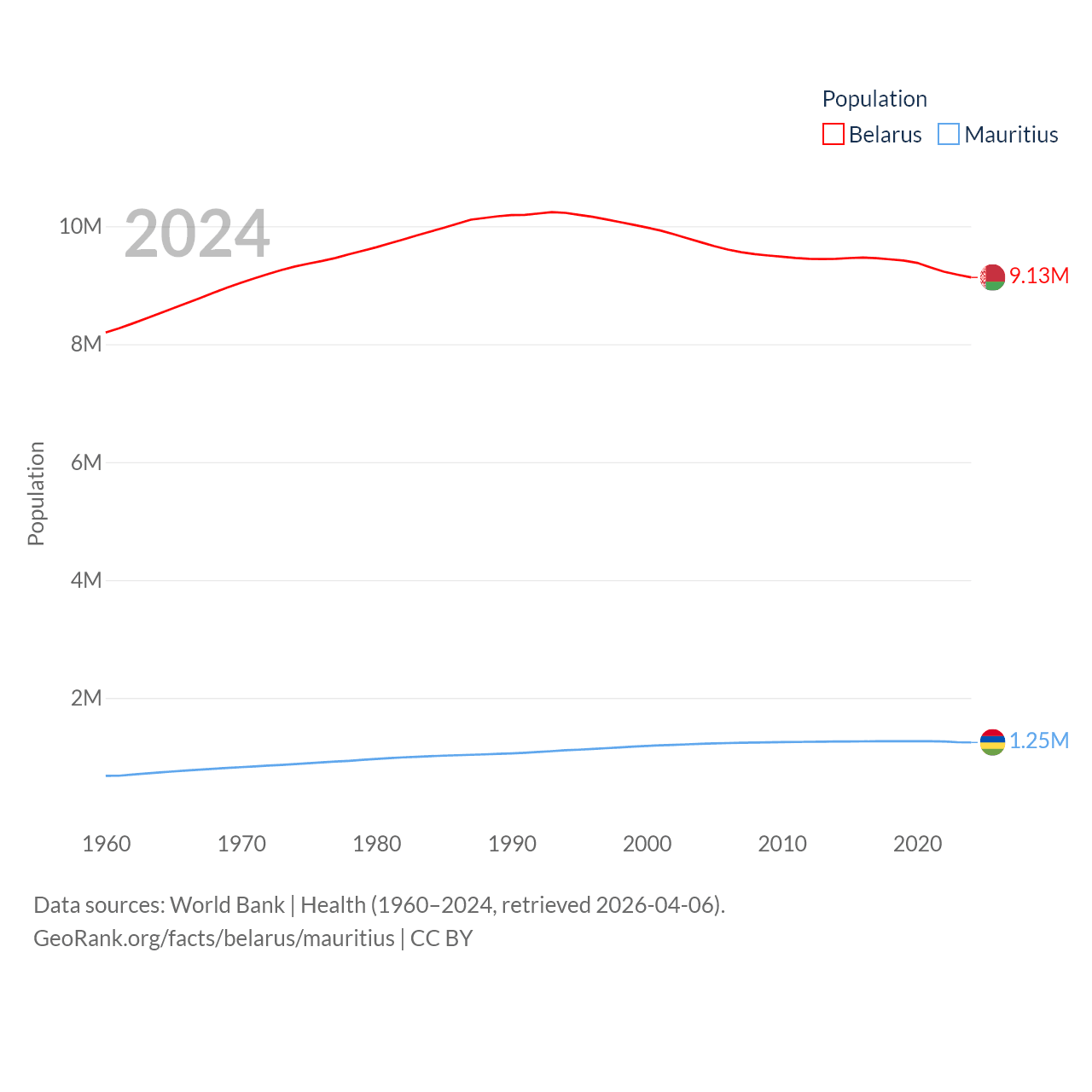 Belarus has a population of 9.13M (ranked 100/197), compared with 1.25M in Mauritius (ranked 156/197). Belarus' land area is 78,372 sq mi versus 771 sq mi for Mauritius (ranked 83rd vs. 170th).