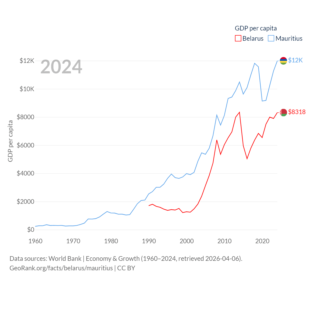 By GDP, Belarus ranks 83/197 ($76B) and Mauritius ranks 143/197 ($14.9B). By GDP per capita, Belarus ranks 92/197 ($8,318), while Mauritius ranks 78/197 ($11,991).