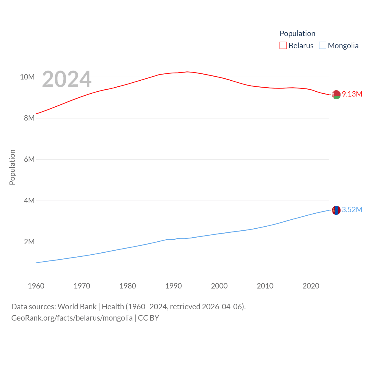 Belarus has a population of 9.13M (ranked 100/197), compared with 3.52M in Mongolia (ranked 132/197). Belarus' land area is 78,372 sq mi versus 601,740 sq mi for Mongolia (ranked 83rd vs. 18th).