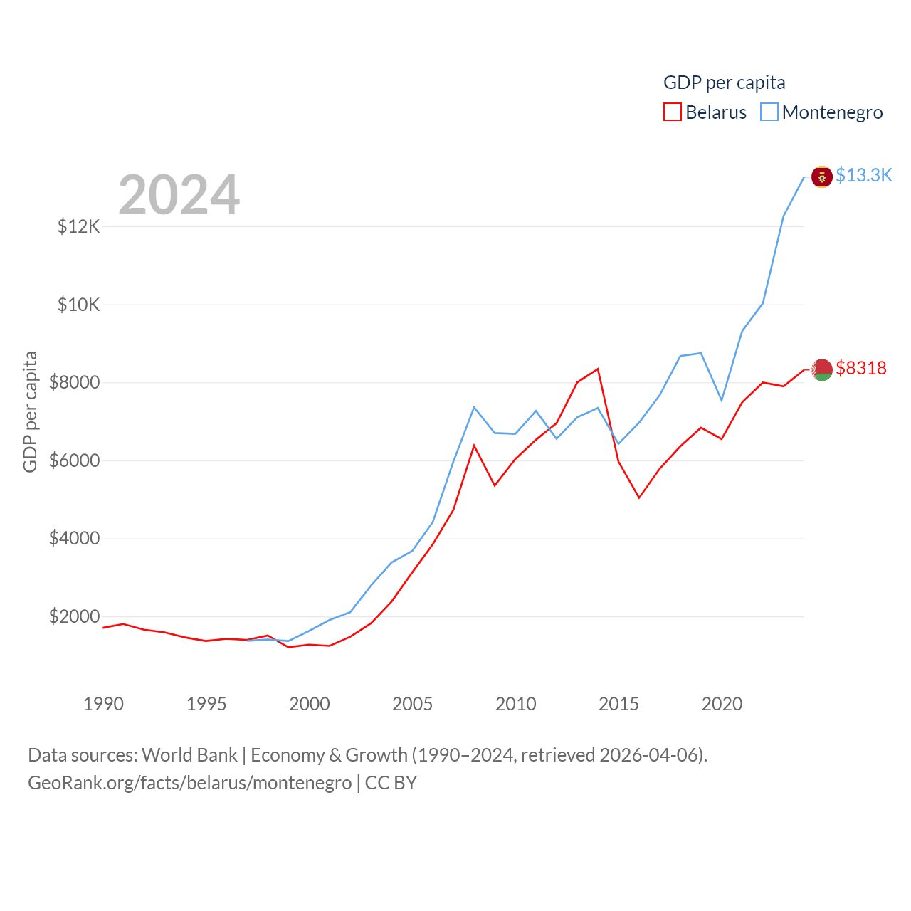 By GDP, Belarus ranks 83/197 ($76B) and Montenegro ranks 155/197 ($8.27B). By GDP per capita, Belarus ranks 92/197 ($8,318), while Montenegro ranks 77/197 ($13,263).