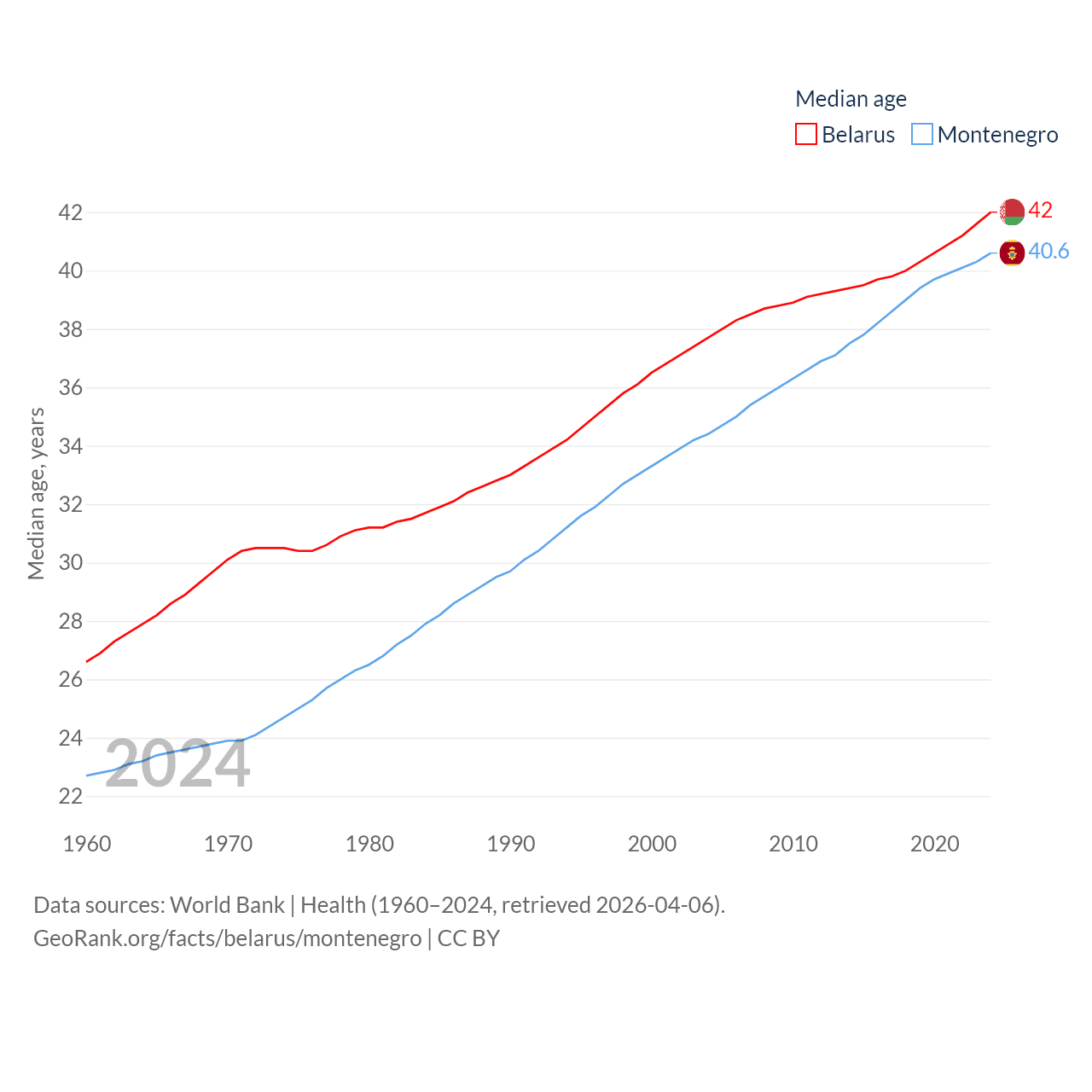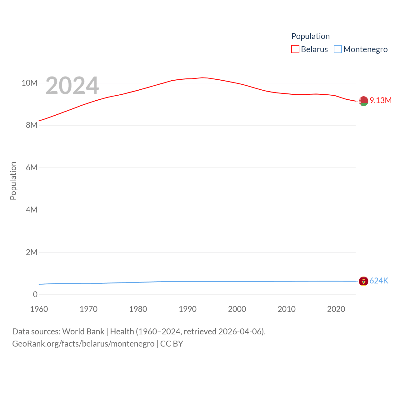 Belarus has a population of 9.13M (ranked 100/197), compared with 624K in Montenegro (ranked 166/197). Belarus' land area is 78,372 sq mi versus 5,193 sq mi for Montenegro (ranked 83rd vs. 156th).