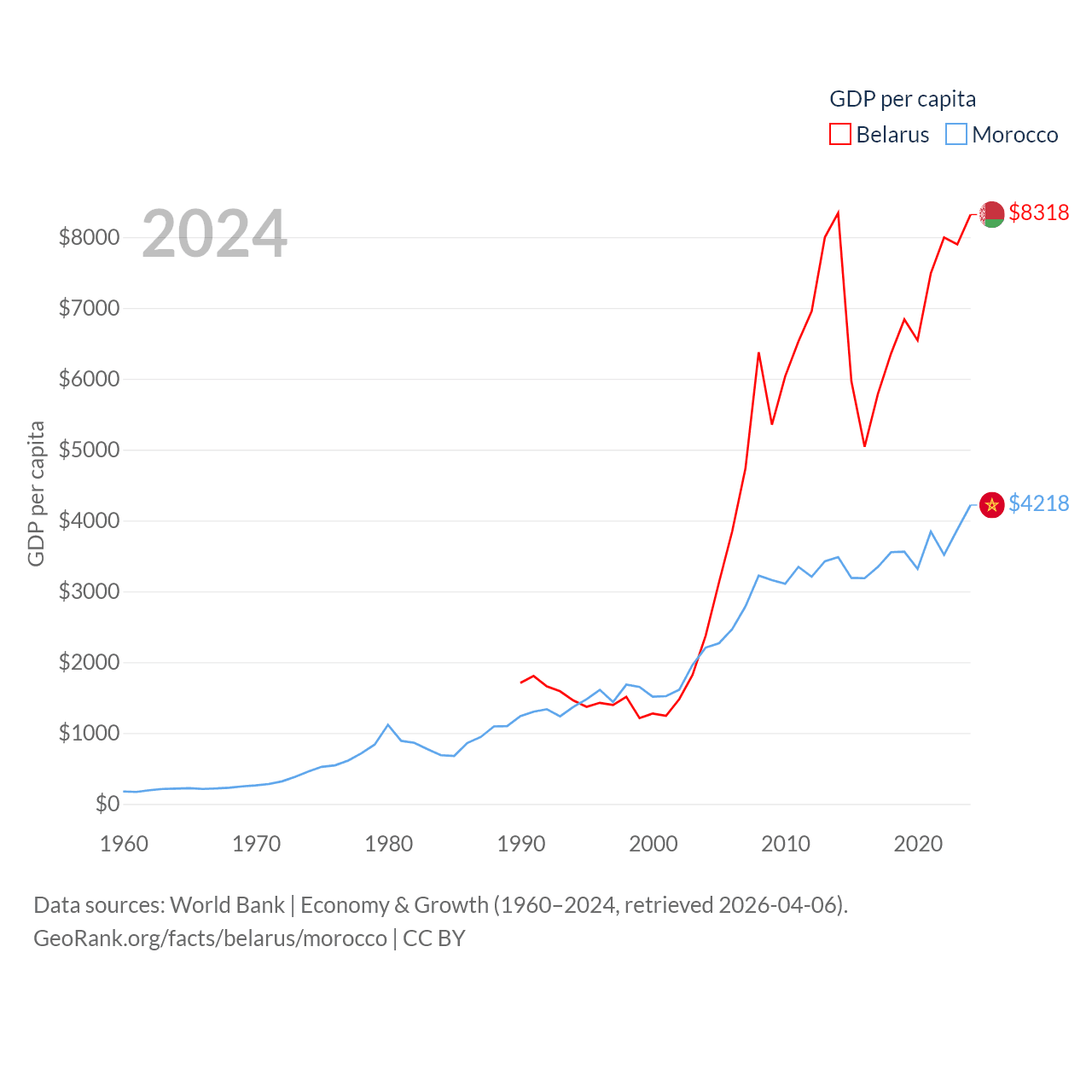 By GDP, Belarus ranks 83/197 ($76B) and Morocco ranks 58/197 ($161B). By GDP per capita, Belarus ranks 92/197 ($8,318), while Morocco ranks 127/197 ($4,218).