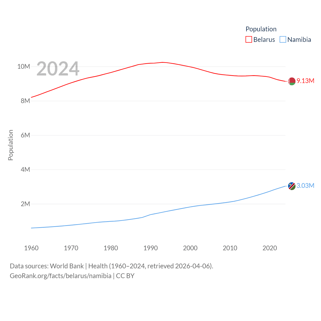 Belarus has a population of 9.13M (ranked 100/197), compared with 3.03M in Namibia (ranked 136/197). Belarus' land area is 78,372 sq mi versus 317,874 sq mi for Namibia (ranked 83rd vs. 33rd).