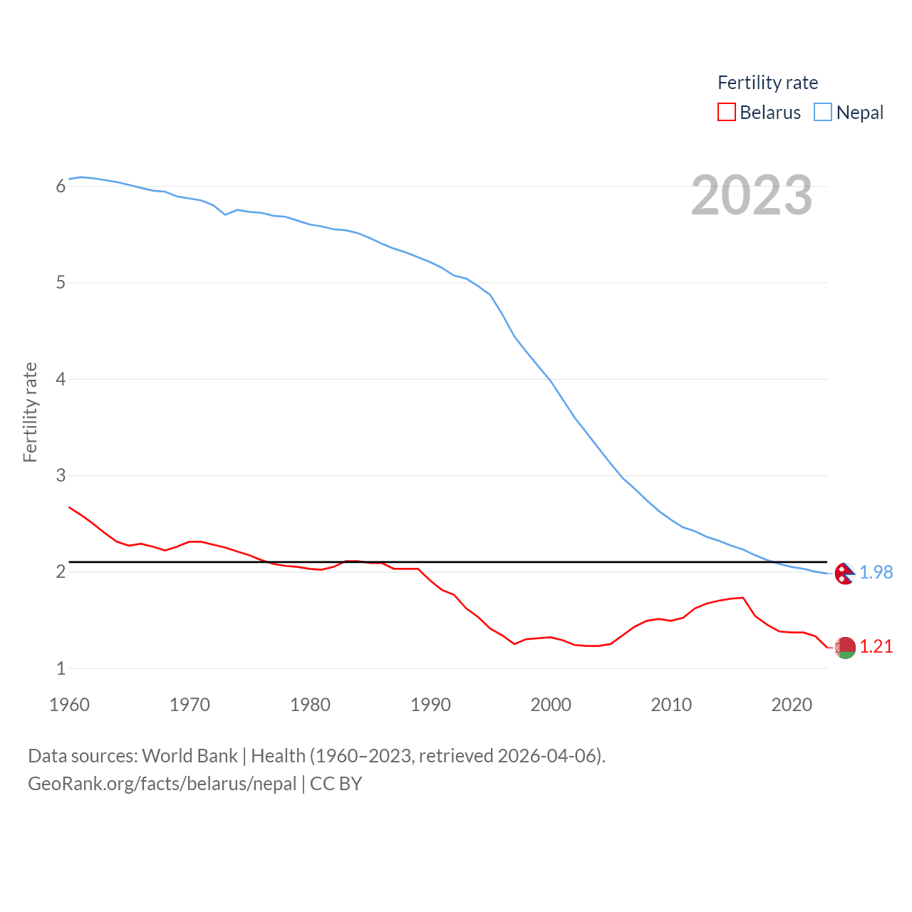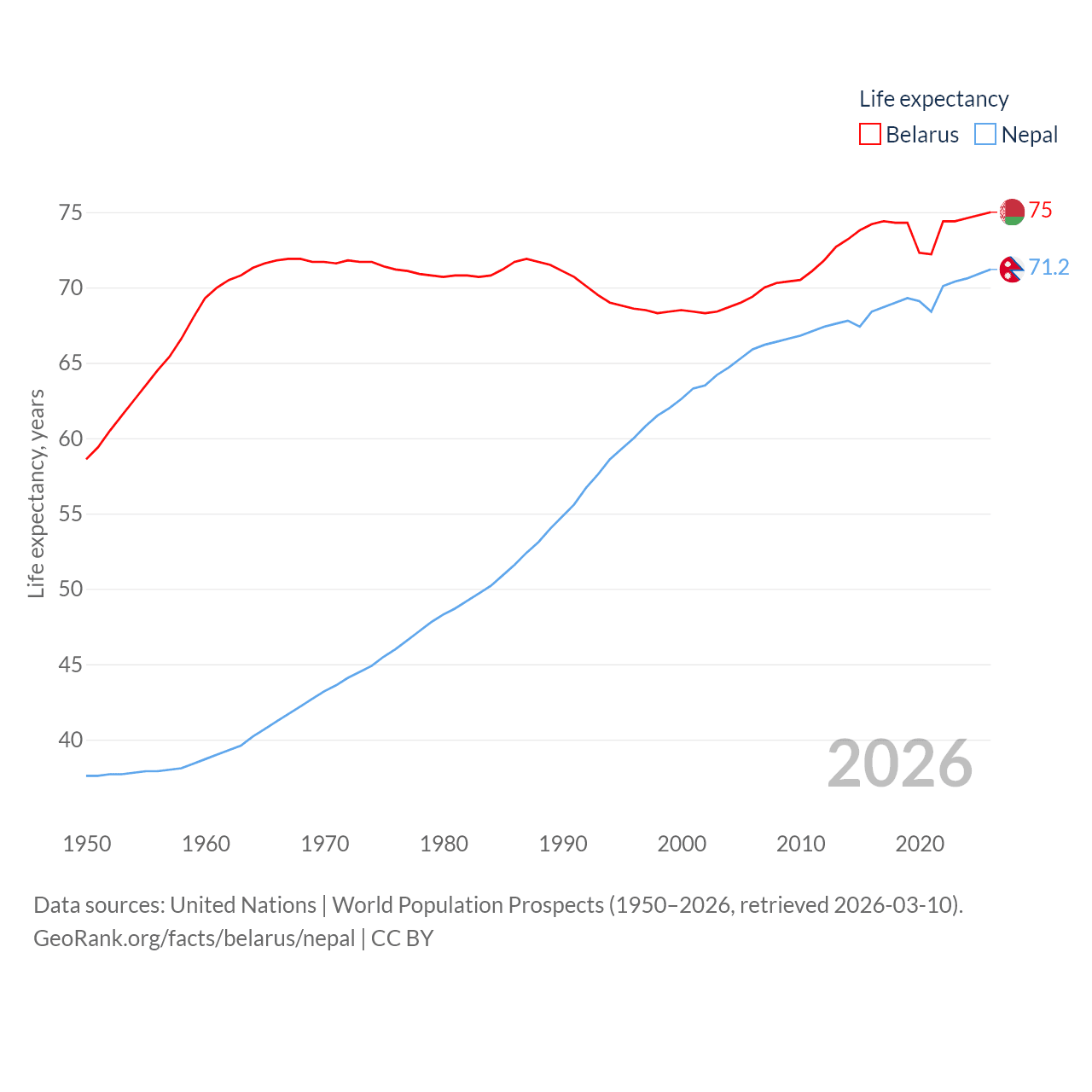 Belarus has a population of 9.13M (ranked 100/197), compared with 29.7M in Nepal (ranked 51/197). Belarus' land area is 78,372 sq mi versus 55,348 sq mi for Nepal (ranked 83rd vs. 92nd).