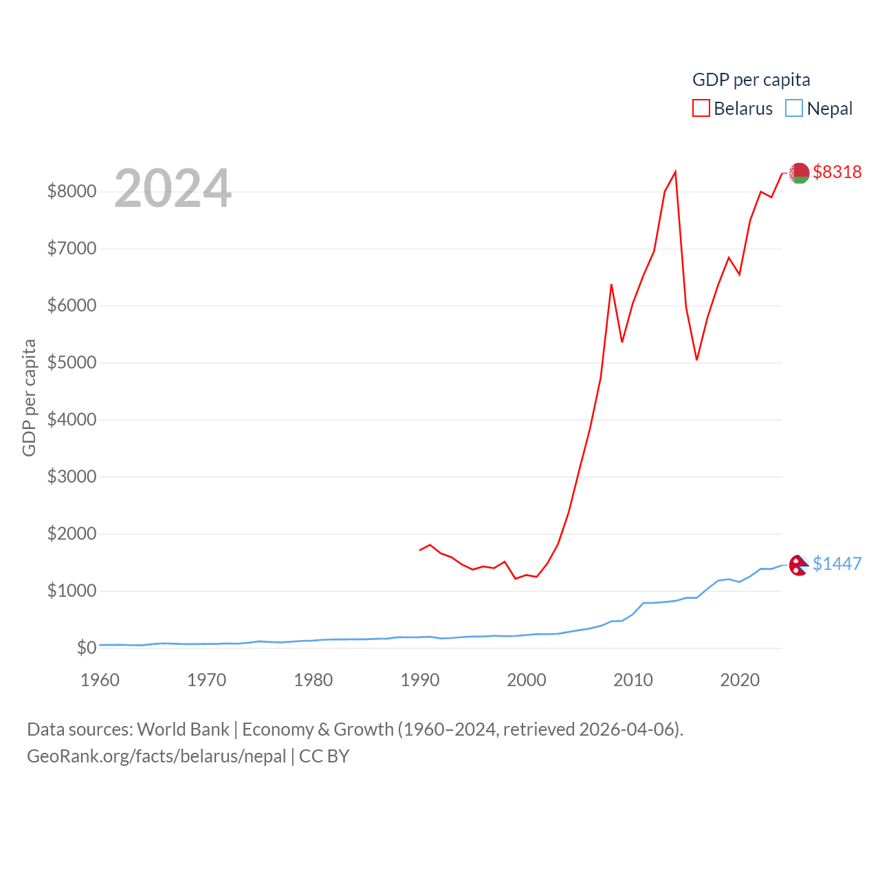 By GDP, Belarus ranks 83/197 ($76B) and Nepal ranks 101/197 ($42.9B). By GDP per capita, Belarus ranks 92/197 ($8,318), while Nepal ranks 164/197 ($1,447).
