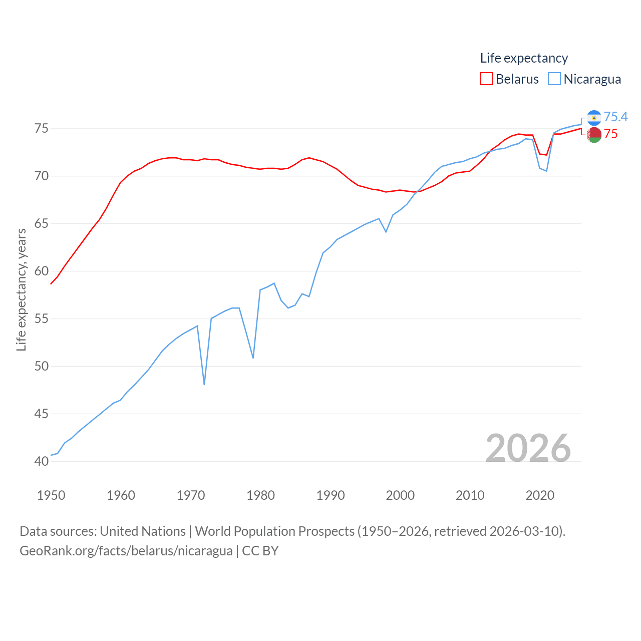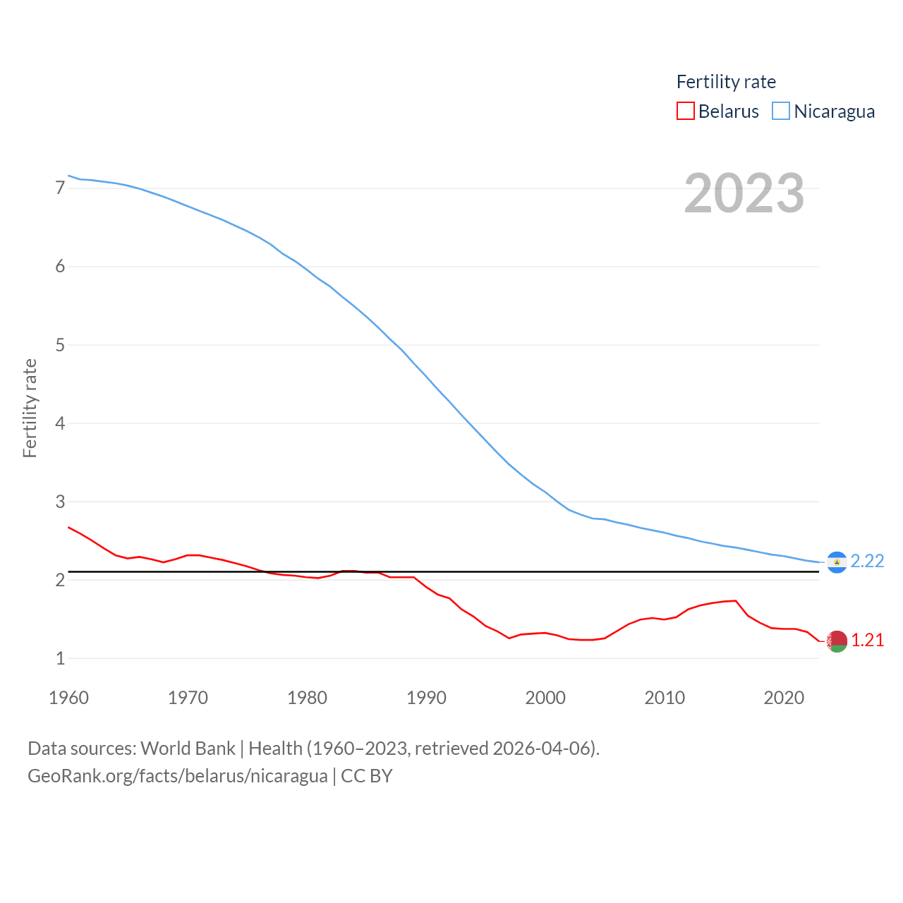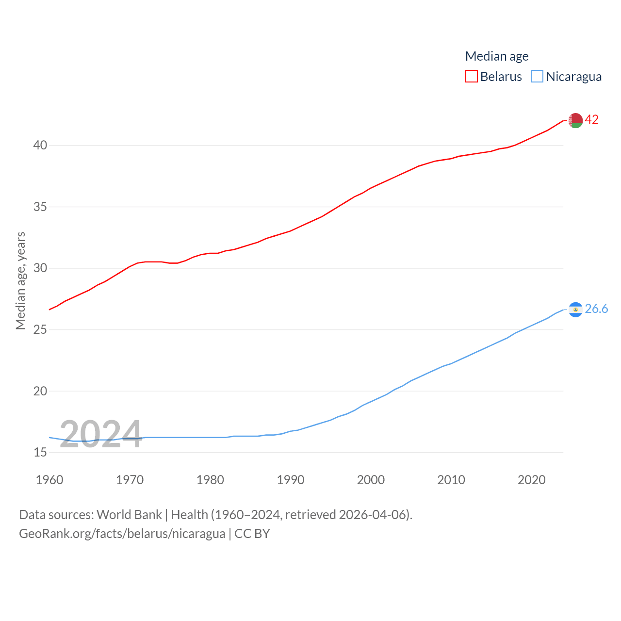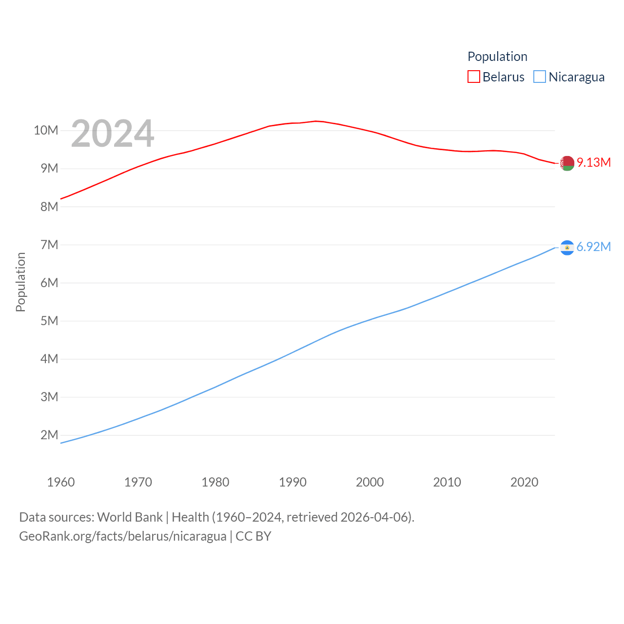 Belarus has a population of 9.13M (ranked 100/197), compared with 6.92M in Nicaragua (ranked 108/197). Belarus' land area is 78,372 sq mi versus 46,464 sq mi for Nicaragua (ranked 83rd vs. 98th).