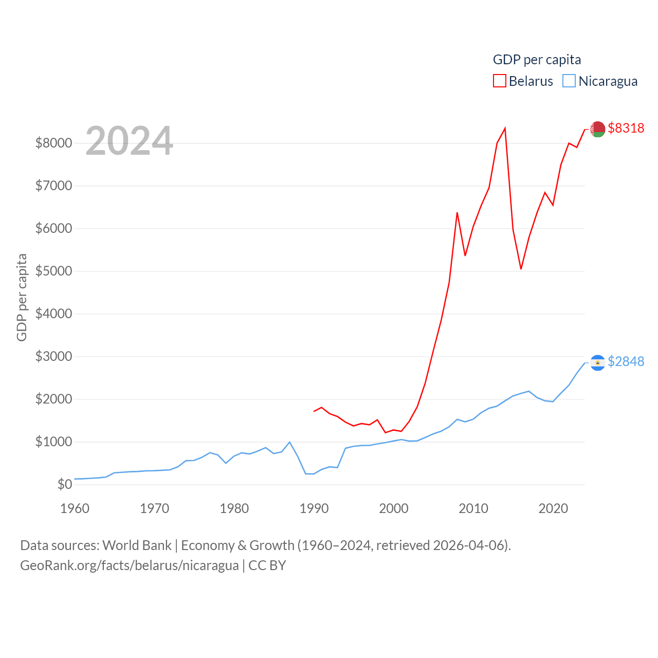 By GDP, Belarus ranks 83/197 ($76B) and Nicaragua ranks 131/197 ($19.7B). By GDP per capita, Belarus ranks 92/197 ($8,318), while Nicaragua ranks 141/197 ($2,848).