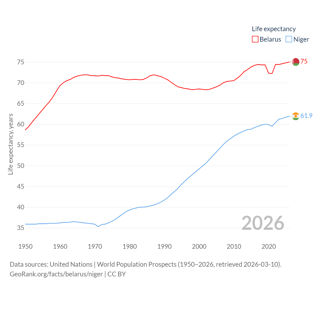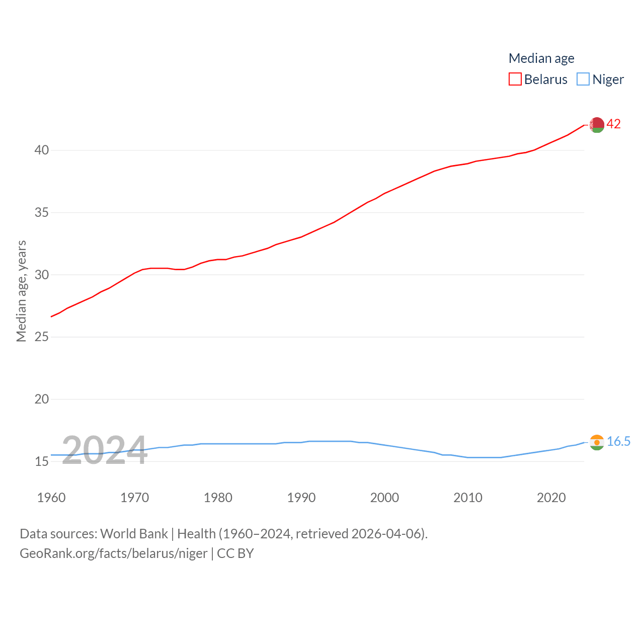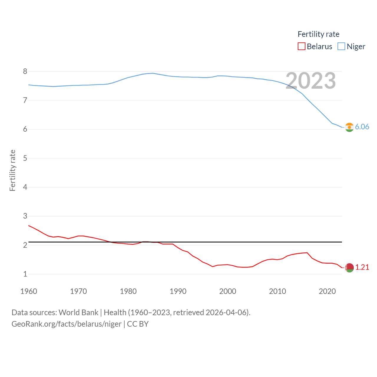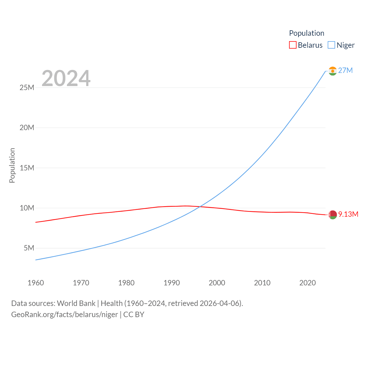 Belarus has a population of 9.13M (ranked 100/197), compared with 27M in Niger (ranked 55/197). Belarus' land area is 78,372 sq mi versus 489,076 sq mi for Niger (ranked 83rd vs. 20th).