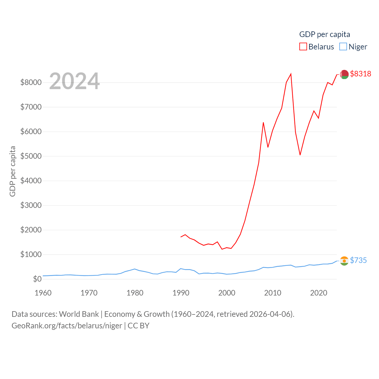By GDP, Belarus ranks 83/197 ($76B) and Niger ranks 130/197 ($19.9B). By GDP per capita, Belarus ranks 92/197 ($8,318), while Niger ranks 187/197 ($735).