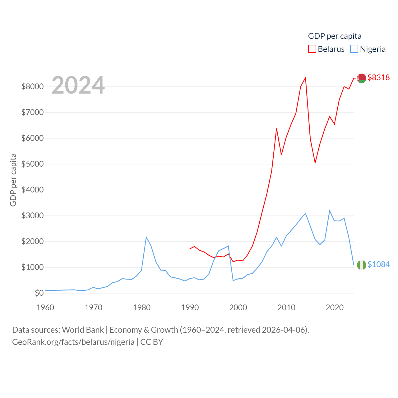By GDP, Belarus ranks 83/197 ($76B) and Nigeria ranks 54/197 ($252B). By GDP per capita, Belarus ranks 92/197 ($8,318), while Nigeria ranks 174/197 ($1,084).