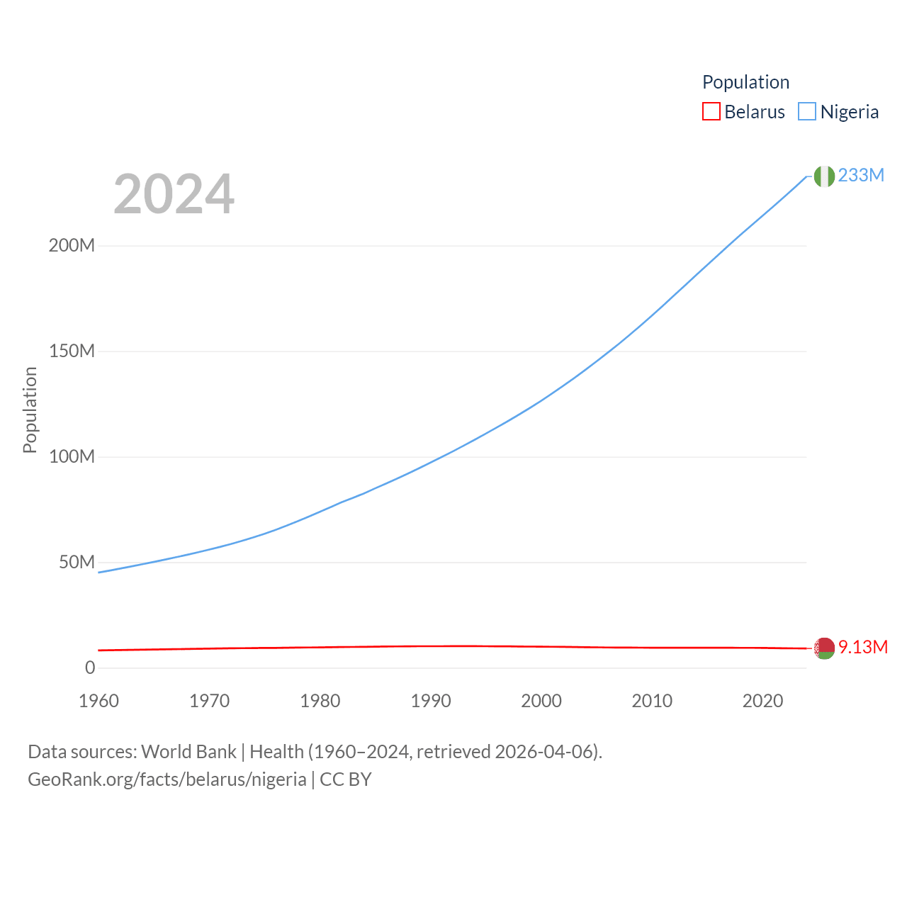 Belarus has a population of 9.13M (ranked 100/197), compared with 233M in Nigeria (ranked 6/197). Belarus' land area is 78,372 sq mi versus 351,650 sq mi for Nigeria (ranked 83rd vs. 30th).