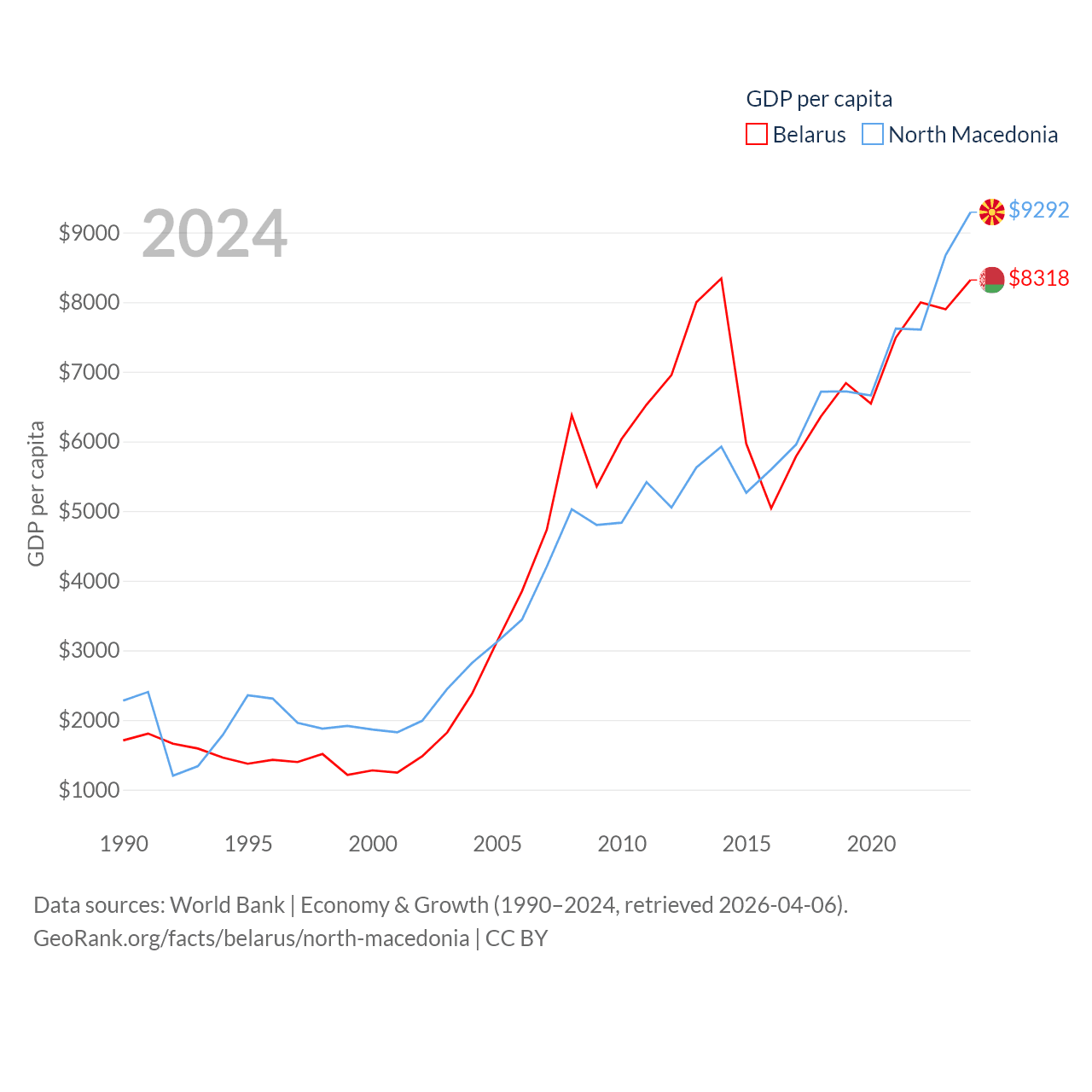 By GDP, Belarus ranks 83/197 ($76B) and North Macedonia ranks 138/197 ($17B). By GDP per capita, Belarus ranks 92/197 ($8,318), while North Macedonia ranks 88/197 ($9,292).